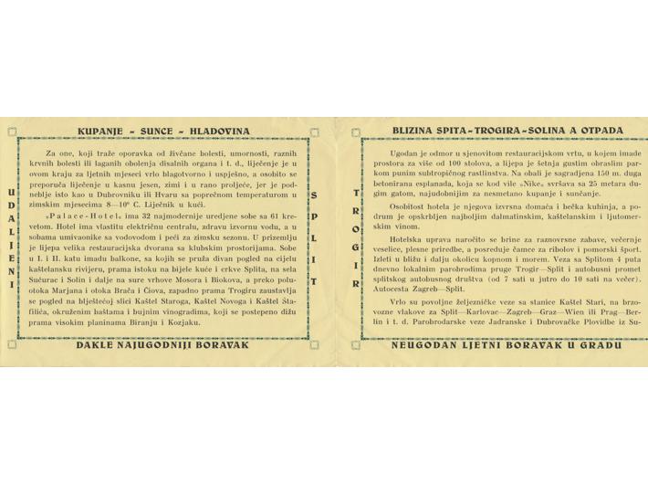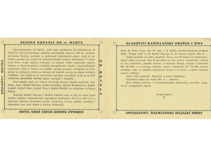 Turistički prospekt - Palace Hotel Kaštel Stari, Riviera Sedam Kaštela kod Splita - Dalmacija, oko 1930. Opis: Turistički prospekt - Palace Hotel Kaštel Stari, Riviera Sedam Kaštela kod Splita - Dalmacija, oko 1930. Preklopljen letak, 15,5x11,5 cm. Stanje odlično. Turistički prospekt - Palace Hotel Kaštel Stari, Riviera Sedam Kaštela kod Splita - Dalmacija, oko 1930. Aukcija: Aukcija br. 65 - Knjige, zemljovidi, plakati Kataloški broj: 1155 Kategorija: Split Trenutna ponuđena cijena je 10EUR, ukoliko želite dati svoju ponudu ona mora biti barem 10EUR ili veća. Upišite vrijednost vaše ponude: Ostali predmeti iz kategorije: Split 1146 250 EUR 1147 350 EUR 1148 9000 EUR 1149 1500 EUR 1150 18 EUR 1151 25 EUR 1152 20 EUR 1153 10 EUR 1154 15 EUR 1155 10 EUR