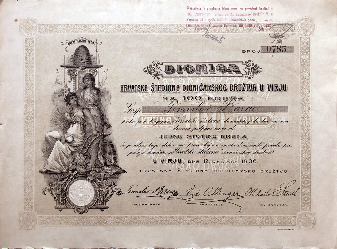 • VIRJE, dionica "Hrvatske štedione" d.d., 100 kruna, 12.2.1906., 36x26 cm