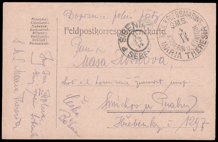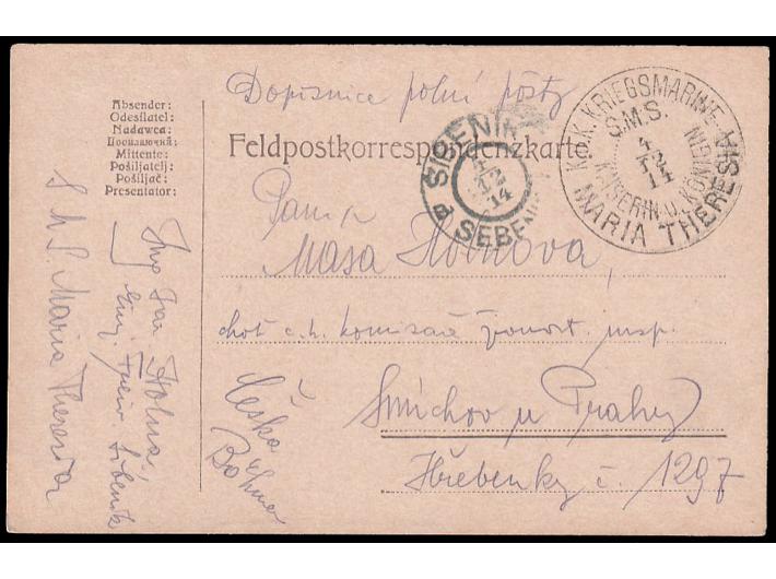 Vojnopoštanska dopisnica upućena s broda S.M.S KAISERIN u. KÖNIGIN / MARIA THEREZIA 14.12. 1914 u Prag. Opis: Vojnopoštanska dopisnica upućena s broda S.M.S KAISERIN u. KÖNIGIN / MARIA THEREZIA 14.12. 1914 u Prag. Odlična kvaliteta. Vojnopoštanska dopisnica upućena s broda S.M.S KAISERIN u. KÖNIGIN / MARIA THEREZIA 14.12. 1914 u Prag. Aukcija: Aukcija br. 63 - Filatelija i razglednice Kataloški broj: 1439 Kategorija: Brodovi Kvaliteta: ✉ Trenutna ponuđena cijena je 20EUR, ukoliko želite dati svoju ponudu ona mora biti barem 20EUR ili veća. Upišite vrijednost vaše ponude: Ostali predmeti iz kategorije: Brodovi ✉ 1429 35 EUR ✉ 1430 20 EUR ✉ 1431 25 EUR ✉ 1432 20 EUR ✉ 1433 35 EUR ✉ 1434 30 EUR ✉ 1435 20 EUR ✉ 1436 14 EUR ✉ 1437 18 EUR ✉ 1438 16 EUR ✉ 1439 20 EUR ✉ 1440 30 EUR ✉ 1441 18 EUR ✉ 1442 16 EUR ✉ 1443 18 EUR ✉ 1444 25 EUR 1445 25 EUR