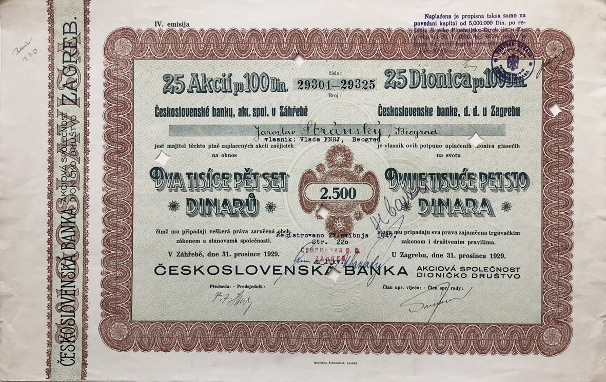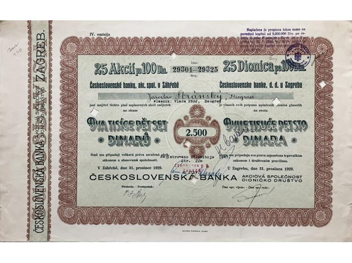 • ZAGREB, dionica "Čehoslovačka banka u Zagrebu", 2500 dinara, 31.12.1929., 38x25 cm