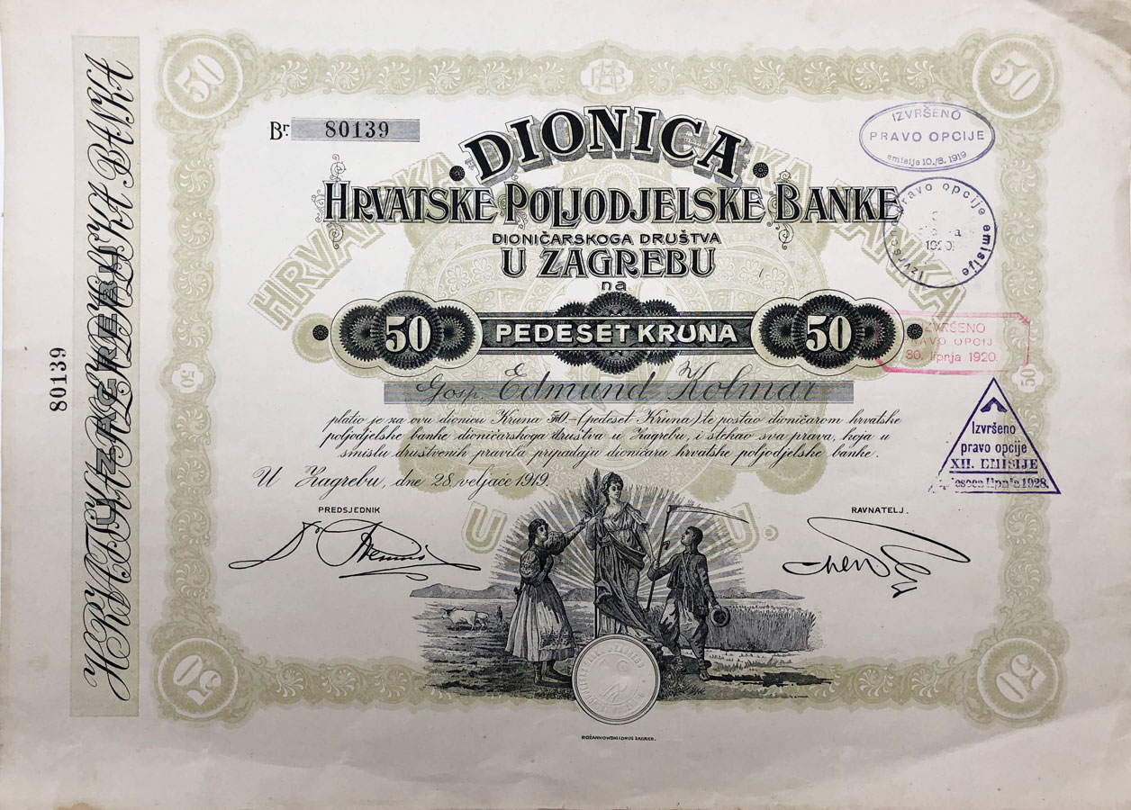 ZAGREB, dionica “HRVATSKE POLJODJELSKE BANKE D. D." , 50 kruna, 28. veljače 1919., 39,5x28,5 cm Opis: ZAGREB, dionica “HRVATSKE POLJODJELSKE BANKE D. D." , 50 kruna, 28. veljače 1919., 39,5x28,5 cm ZAGREB, dionica “HRVATSKE POLJODJELSKE BANKE D. D." , 50 kruna, 28. veljače 1919., 39,5x28,5 cm Aukcija: Aukcija br. 67 - Numizmatika, militarija Kataloški broj: 204 Kategorija: Dionice - Hrvatska Trenutna ponuđena cijena je 15EUR, ukoliko želite dati svoju ponudu ona mora biti barem 15EUR ili veća. Upišite vrijednost vaše ponude: Ostali predmeti iz kategorije: Dionice - Hrvatska 196 75 EUR 197 90 EUR 198 85 EUR 199 35 EUR 200 70 EUR 201 25 EUR 202 30 EUR 203 15 EUR 204 15 EUR 205 100 EUR 206 35 EUR 207 12 EUR 208 12 EUR 209 12 EUR 210 5 EUR 211 15 EUR 212 15 EUR 213 20 EUR 214 15 EUR 215 10 EUR