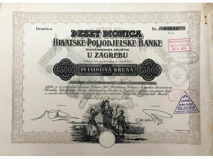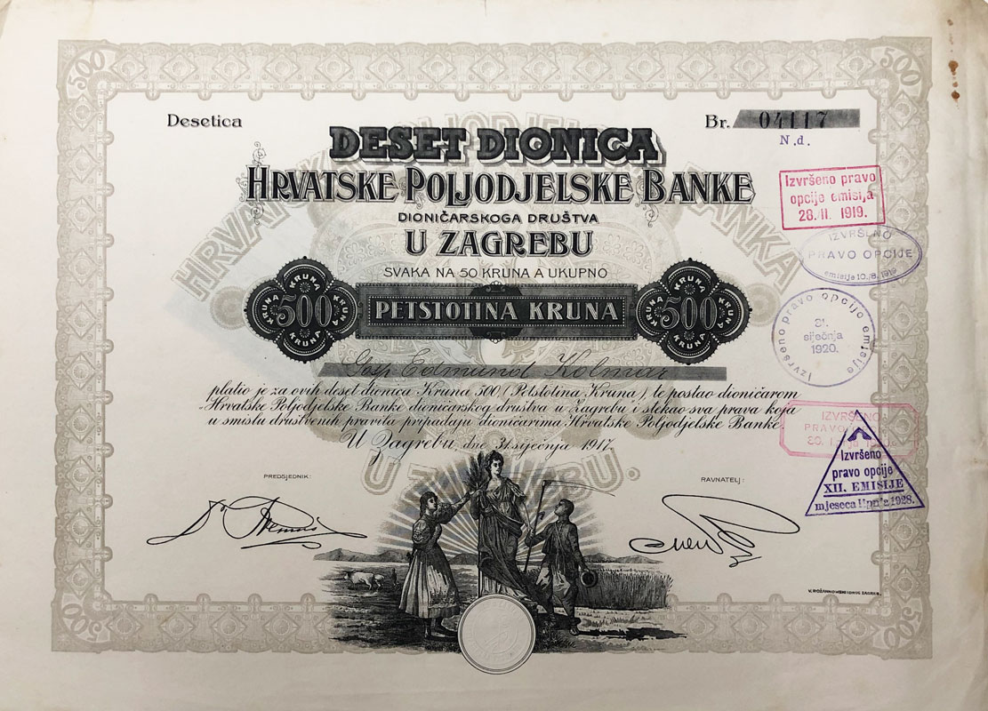 ZAGREB, dionica “HRVATSKE POLJODJELSKE BANKE D. D." , 500 kruna, 31. siječanj 1917., 40x29 cm