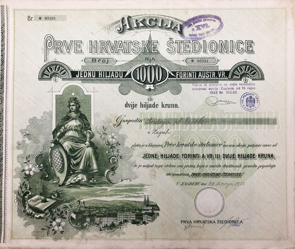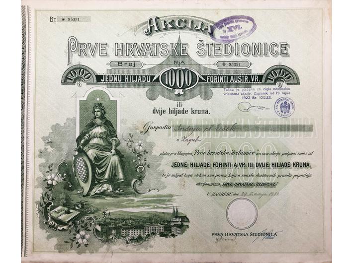Opis: ZAGREB, dionica “PRVE HRVATSKE ŠTEDIONICE" , 1000 forinti, 29. travanj 1922., 38x32 cm