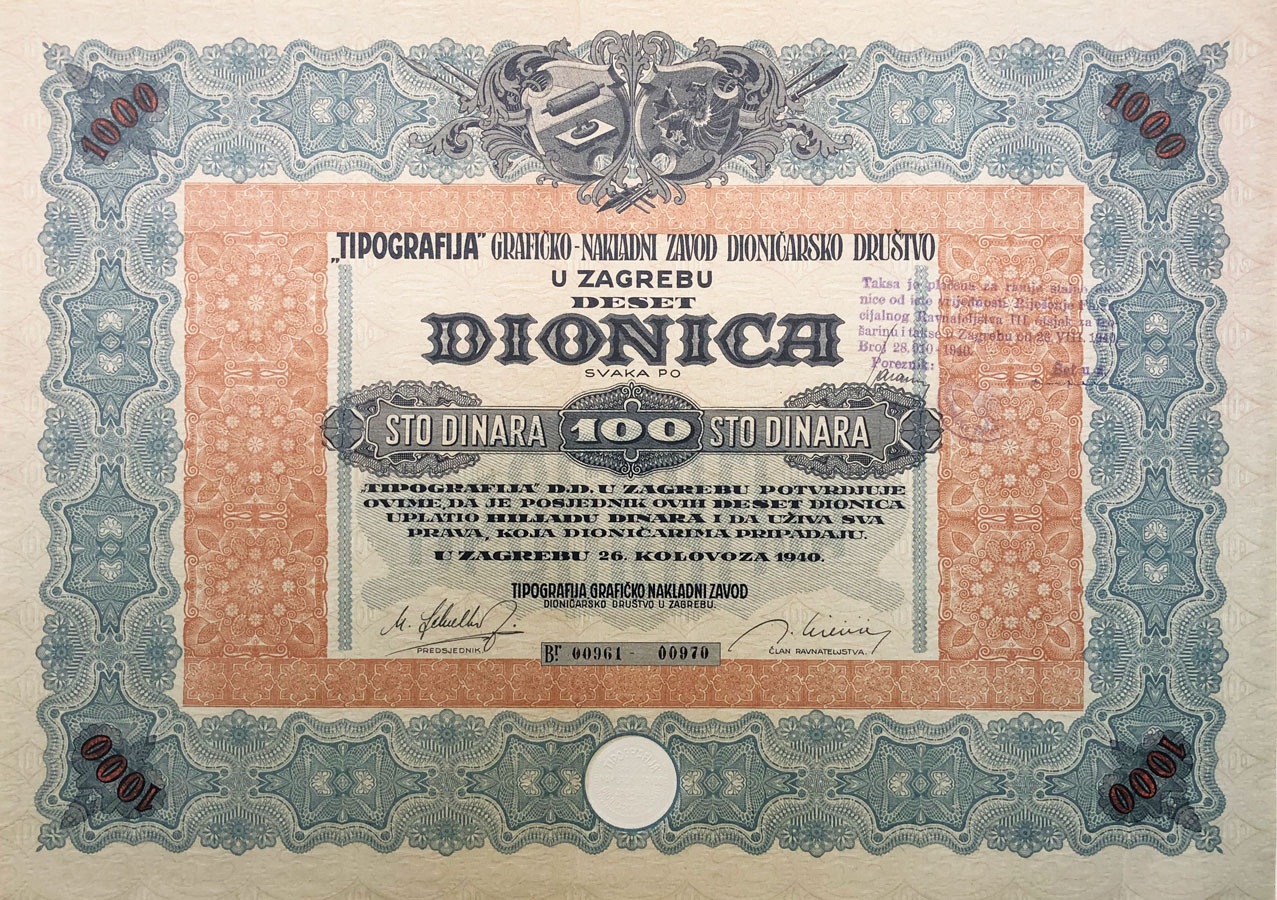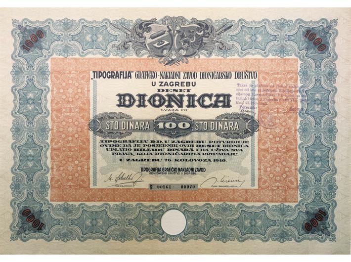 ZAGREB, dionica “TIPOGRAFIJA” grafičko-nakladni zavod d.d., 100 dinara, 26.08.1940., 35x25 cm Opis: ZAGREB, dionica “TIPOGRAFIJA” grafičko-nakladni zavod d.d., 100 dinara, 26.08.1940., 35x25 cm ZAGREB, dionica “TIPOGRAFIJA” grafičko-nakladni zavod d.d., 100 dinara, 26.08.1940., 35x25 cm Aukcija: Aukcija br. 67 - Numizmatika, militarija Kataloški broj: 214 Kategorija: Dionice - Hrvatska Trenutna ponuđena cijena je 15EUR, ukoliko želite dati svoju ponudu ona mora biti barem 15EUR ili veća. Upišite vrijednost vaše ponude: Ostali predmeti iz kategorije: Dionice - Hrvatska 196 75 EUR 197 90 EUR 198 85 EUR 199 35 EUR 200 70 EUR 201 25 EUR 202 30 EUR 203 15 EUR 204 15 EUR 205 100 EUR 206 35 EUR 207 12 EUR 208 12 EUR 209 12 EUR 210 5 EUR 211 15 EUR 212 15 EUR 213 20 EUR 214 15 EUR 215 10 EUR