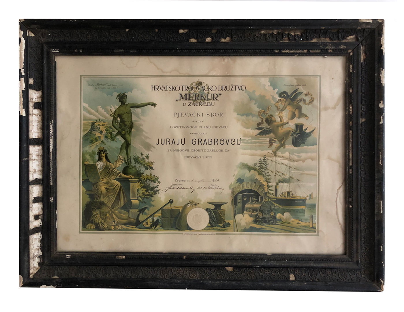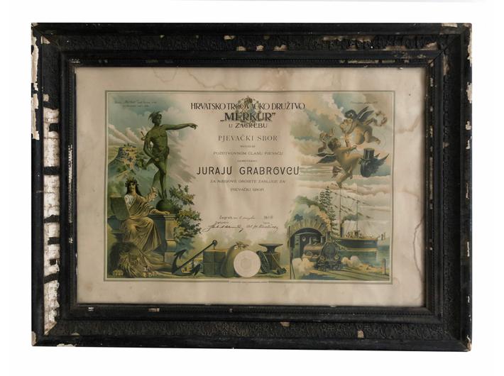 Opis: ZAGREB, Diploma za Juraja Grabovca, 1904. Hrvatsko Trgovačko Društvo "MERKUR". Uramljeno 77x57 cm.