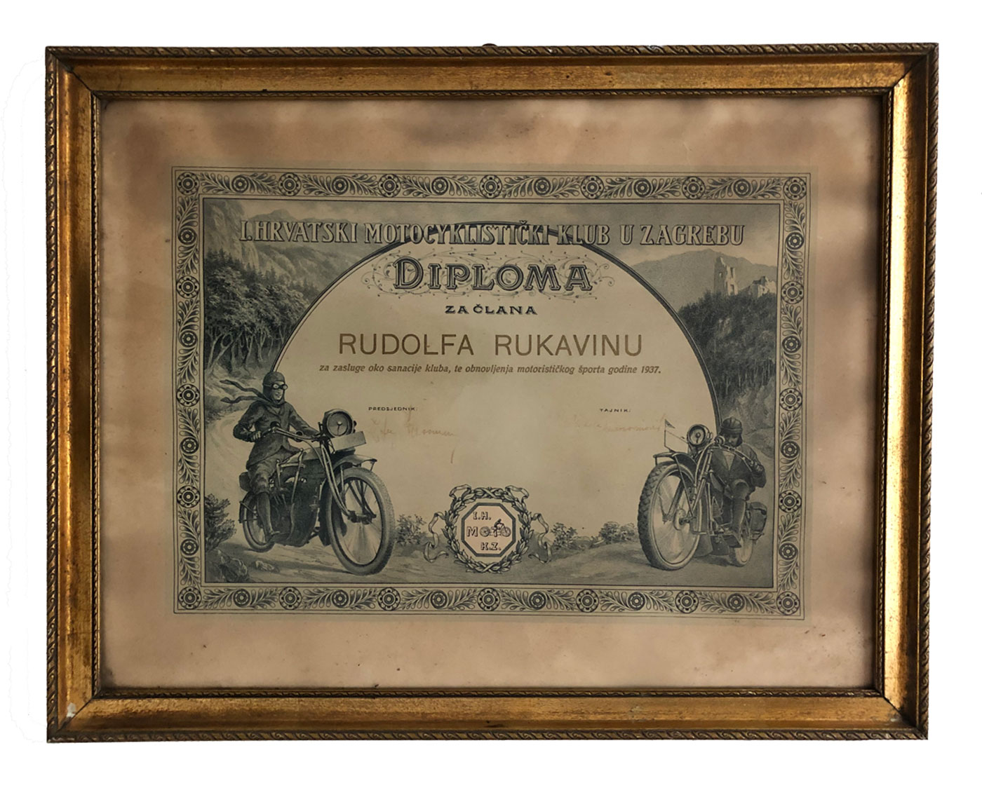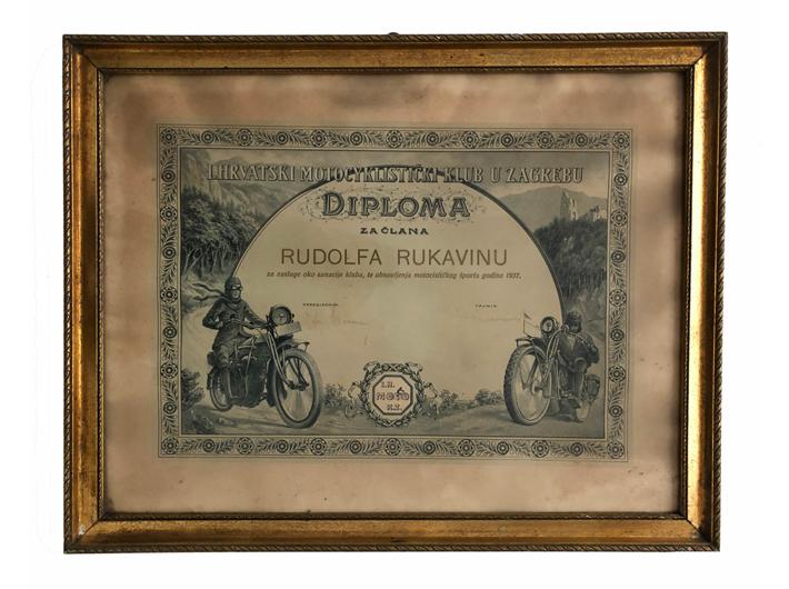 Opis: ZAGREB, Diploma za Rudolfa Rukavinu - I. Hrvatski Motociklistički klub 1937. Uramljeno 52x41 cm. UNIKAT