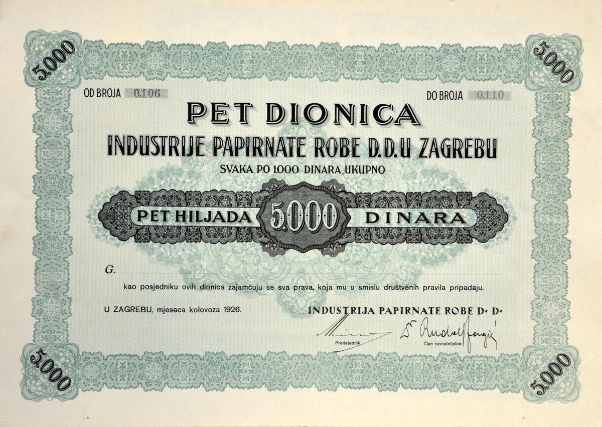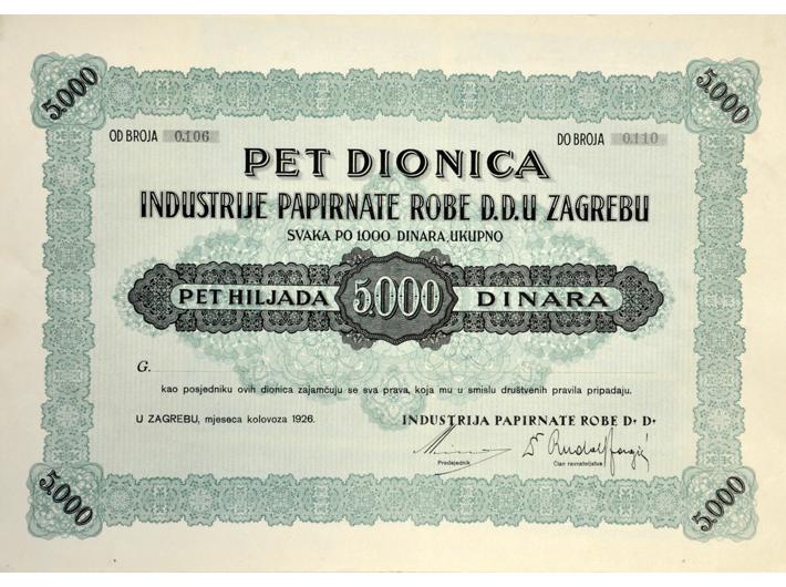 ZAGREB, Industrija papirnate robe d.d. u Zagrebu, dionica na 5 000 dinara, izdana u kolovozu 1926. 36x25 cm Opis: ZAGREB, Industrija papirnate robe d.d. u Zagrebu, dionica na 5 000 dinara, izdana u kolovozu 1926. 36x25 cm ZAGREB, Industrija papirnate robe d.d. u Zagrebu, dionica na 5 000 dinara, izdana u kolovozu 1926. 36x25 cm Aukcija: Aukcija br. 64 - Numizmatika, militarija Kataloški broj: 354 Kategorija: Dionice - Hrvatska Trenutna ponuđena cijena je 8EUR, ukoliko želite dati svoju ponudu ona mora biti barem 8EUR ili veća. Upišite vrijednost vaše ponude: Ostali predmeti iz kategorije: Dionice - Hrvatska 335 80 EUR 336 40 EUR 337 35 EUR 338 15 EUR 339 30 EUR 340 20 EUR 341 30 EUR 342 100 EUR 343 60 EUR 344 10 EUR 345 8 EUR 346 18 EUR 347 20 EUR 348 12 EUR 349 30 EUR 350 10 EUR 351 15 EUR 352 22 EUR 353 15 EUR 354 8 EUR 12→
