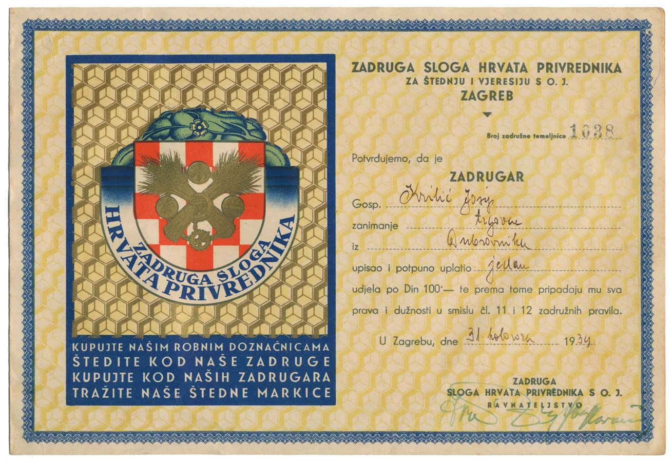 Opis: ZAGREB, zadruga "SLOGA", vrlo atraktivna pristupnica - potvrda o uplati članarine, 220x151 mm