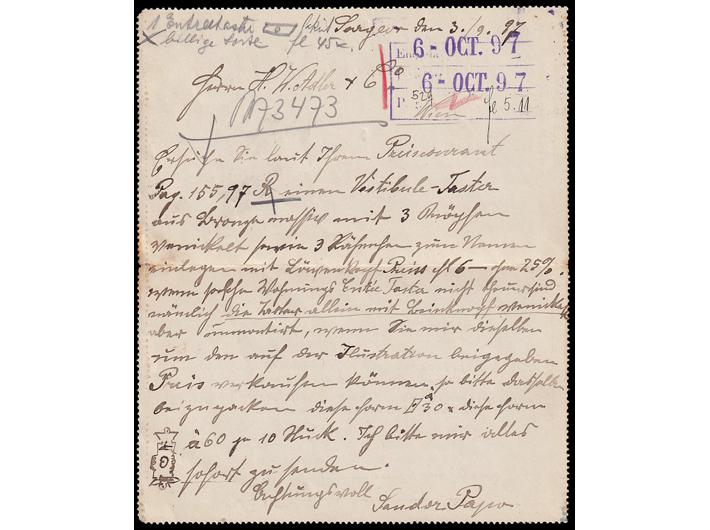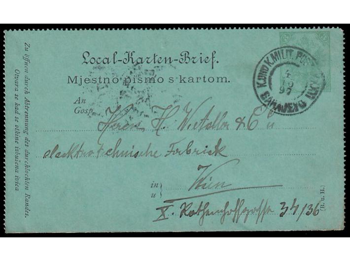 Zatvorena dopisnica za loko promet upućena iz Sarajeva u Beč 04.10. 1897. Opis: Zatvorena dopisnica za loko promet upućena iz Sarajeva u Beč 04.10. 1897. Dolaz na poleđini. Rijetka kombinacija, dobra kvaliteta. Zatvorena dopisnica za loko promet upućena iz Sarajeva u Beč 04.10. 1897. Aukcija: Aukcija br. 63 - Filatelija i razglednice Kataloški broj: 678 Kategorija: Bosna i Hercegovina Kvaliteta: ✉ Trenutna ponuđena cijena je 25EUR, ukoliko želite dati svoju ponudu ona mora biti barem 25EUR ili veća. Upišite vrijednost vaše ponude: Ostali predmeti iz kategorije: Bosna i Hercegovina * 618 100 EUR * 619 40 EUR ** 620 45 EUR ** 621 200 EUR * 622 40 EUR **/* 623 120 EUR * 624 150 EUR ** 625 25 EUR * 626 50 EUR ** 627 50 EUR ** 628 40 EUR * 629 30 EUR * 630 30 EUR **/* 631 70 EUR * 632 100 EUR * 633 40 EUR ** 634 60 EUR * 635 20 EUR * 636 20 EUR ** 637 25 EUR 1234→
