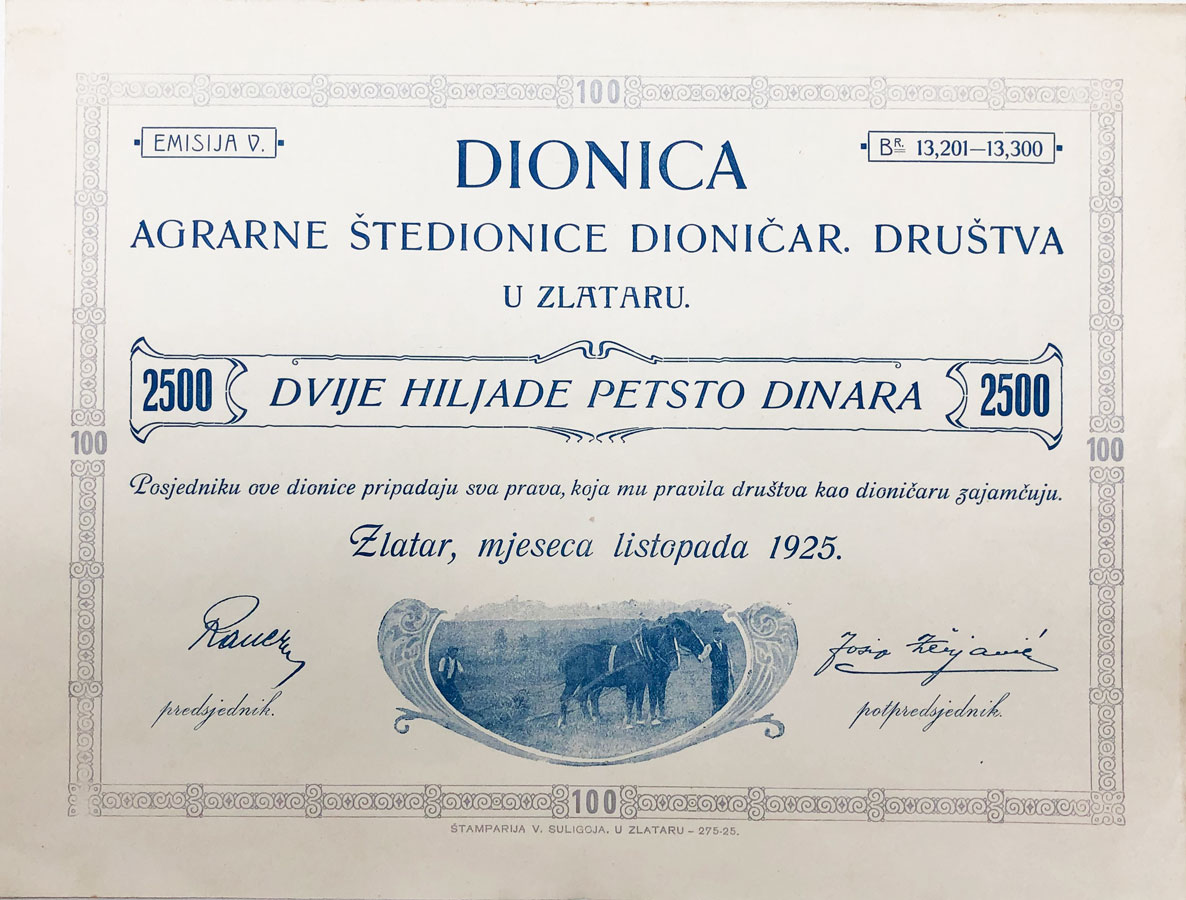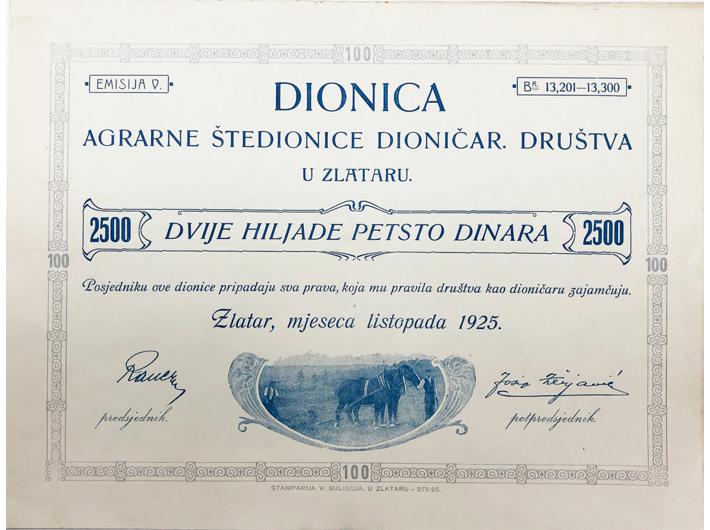 ZLATAR, dionica “AGRARNE ŠTEDIONICE D. D. U ZLATARU", 2500 dinara, listopad 1925., 31,5x24 cm Opis: ZLATAR, dionica “AGRARNE ŠTEDIONICE D. D. U ZLATARU", 2500 dinara, listopad 1925., 31,5x24 cm ZLATAR, dionica “AGRARNE ŠTEDIONICE D. D. U ZLATARU", 2500 dinara, listopad 1925., 31,5x24 cm Aukcija: Aukcija br. 67 - Numizmatika, militarija Kataloški broj: 209 Kategorija: Dionice - Hrvatska Trenutna ponuđena cijena je 12EUR, ukoliko želite dati svoju ponudu ona mora biti barem 12EUR ili veća. Upišite vrijednost vaše ponude: Ostali predmeti iz kategorije: Dionice - Hrvatska 196 75 EUR 197 90 EUR 198 85 EUR 199 35 EUR 200 70 EUR 201 25 EUR 202 30 EUR 203 15 EUR 204 15 EUR 205 100 EUR 206 35 EUR 207 12 EUR 208 12 EUR 209 12 EUR 210 5 EUR 211 15 EUR 212 15 EUR 213 20 EUR 214 15 EUR 215 10 EUR