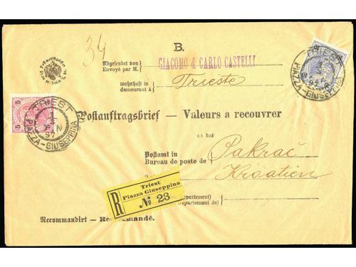 Auction 48 - Philately and postcards Croatia until 1918 ☉ 22 - Austria 9 kr. Mi.No. 5, with very nice cancel FIUME. 40 EUR ✉ 23 - Cover of letter sent from IMOSCHI (Imotski) to MACARSCA (Makarska). 45 EUR ✉ 24 - Letter with complete content sent from Zagreb 22.10. 1855 12 EUR ✉ 25 - Complete newspapers Osservatore Dalmato, franked with newspapers stamp 70 EUR ✉ 26 - Letter with complete content sent from Fiume (Rijeka) to Trieste 14 EUR ✉ 27 - Letter sent from Zadar to Venezia 16.12. 1888 14 EUR ✉ 28 - Letter sent by registered mail from Trieste to Pakrac 1892. 25 EUR ✉ 29 - Letter sent by registered mail from Trieste to Pakrac 01.03. 1897 35 EUR ✉ 30 - Letter sent by registered mail from Trieste to Pakrac 02.06. 1899. 35 EUR ✉ 31 - Letter sent from Zagreb to Kostajnica 20.10. 1863 10 EUR ☉ 32 - Mi.No. 37 IA with very nice cancel PERMANI 11/11. 12 EUR ✉ 33 - Letter with complete content sent from VERLICCA (Vrlika) 25 EUR 1234→
