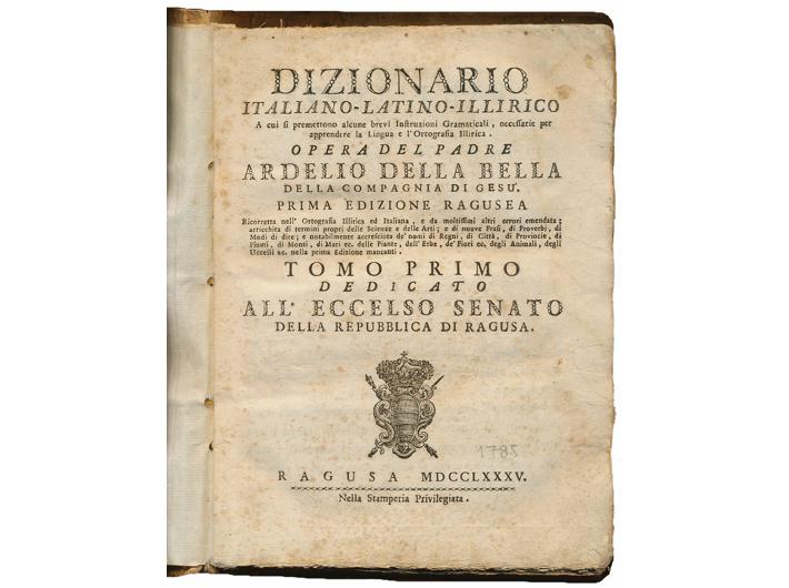 Description: Ardelio Della Bella: Dizionario italiano - latino - illirico... I – II Dizionario italiano-latino-illirico a cui si premettono alcune brevi instruzioni grammaticali necessarie per apprendere la lingua e l'ortografia illirica. Ragusa: Nella stamperia priviliegiata, 1785. 396 + 448 str., 18x24 cm. Stanje dobro. Za oba toma je izrađena posebna zaštitna kutija. Ardelio Della Bella, hrvatski jezikoslovac talijanskog podrijetla (Foggia, 14. II. 1655 – Split, 3. XII. 1737). Školovao se i predavao u Italiji, djelovao kao isusovački misionar u Dubrovniku i Dalmaciji, bio profesor i rektor u dubrovačkome Isusovačkom kolegiju. Propovijedao na hrvatskom jeziku (Razgovori i pripovidagna oza Ardelia Della Bella, objavio Matija Čulić oko 1805). Trojezični rječnik (Dizionario italiano, latino, illirico, 1728), osim što sadrži ondašnji dubrovački leksik, frazeme i poslovice, prvi je hrvatski povijesni rječnik (oko 30 000 riječi) s mnogobrojnim citatima iz četrdesetak rukopisnih i tiskanih književnih djela štokavske i čakavske dijalektne osnove. Uz rječnik su tiskane i upute za čitanje i pisanje, rasprava o hrvatskom naglasku (Avvertimenti per leggere con facilità le parole illiriche scritte con lettere italiane) i hrvatska gramatika na talijanskom jeziku (Istruzioni grammaticali della lingua illirica; samostalno Osnovna načela ilirske gramatike – Principi elementari della grammatica illirica, 1837), koja je stotinjak godina bila školski udžbenik. Utjecao je na leksikografe i gramatičare još i u narodnom preporodu te na srpskog filologa Vuka Stefanovića Karadžića. Gramatiku je pisao po uzoru na Kašićevu, ali je iznio i samostalna zapažanja o prozodijskom sustavu, o gramatičkim kategorijama te dao bolju razredbu riječi u vrste. Njegova je jekavština ugrađena u temelje hrvatskoga standardnoga jezika.