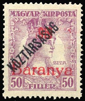 Baranya stamp from series Karlo and Zita, 50 fil with overprint Baranya Description: Baranya stamp from series Karlo and Zita, 50 fil with overprint Baranya. Not issued. Rare. Baranya stamp from series Karlo and Zita, 50 fil with overprint Baranya Auction: Aukcija br. 48 - Filatelija i razglednice Catalog No: 236 Category: Dalmatia Quality: * Current offer is at 30EUR. In order to place your bid your offer needs to be at least 30EUR or higher. Please place your bid: Other items from the category: Dalmatia **/* 230 40 EUR **/* 231 30 EUR **/* 232 30 EUR **/* 233 50 EUR ** 234 35 EUR **/* 235 40 EUR * 236 30 EUR **/*/⦿ 237 40 EUR ** 238 30 EUR ** 239 40 EUR ** 240 30 EUR ** 241 60 EUR ✉ 242 30 EUR ✉ 243 30 EUR ✉ 244 30 EUR ✉ 245 16 EUR 246 150 EUR 247 350 EUR 248 60 EUR 249 40 EUR 123→