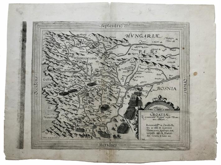 Description: Gerard de Jode: Croatiae et circumiacentium Regionum versus Turciam nova delineatio. Antwerpen, 1593. 32x40 cm. Zemljovid prikazuje stanje uoči bitke kod Siska 1593. godine. Na području Hrvatske se nalaze veće vojne formacije, turske jedinice oko Une, a kršćanske oko Kupe. Zemljovid je jedan od rijetkih prikaza Hrvatske u njezinom najmanjem prostornom opsegu. Iako na njoj nisu ucrtane nove turske granice, granica se vidi na temelju oznake polumjeseca na utvrdama koje su osvojene. Kao najzapadnije uporište Turaka označena je Čazma, a južno od Save Hrastovica i Drežnik koji su osvojeni 1592. godine. S obzirom na aktualnost podataka, očito je da je kao predložak poslužio neki habsburški vojni izvještaj ili vojna skica. Naslov zemljovida nalazi se u desnom donjem uglu u renesansnoj kartuši. Zemljovid je objavljen u atlasu Cornelisa de Jodea.