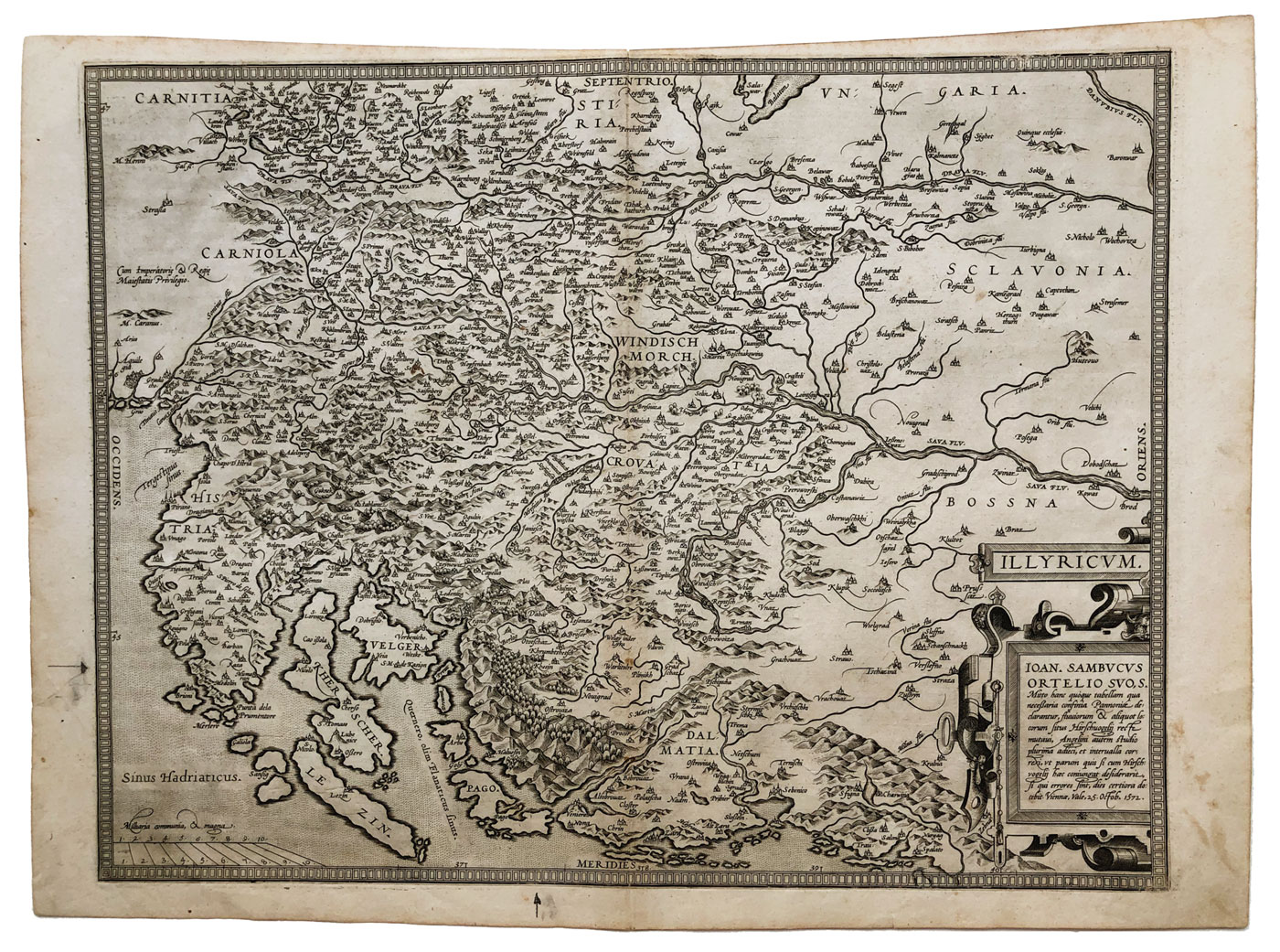 Description: Johannes Sambucus: Ilirik / Irryricum. Antwerpen, 1572. 48 x 37 cm. Zemljovid je za Orteliusov atlas izradio ugarski kartograf Isztvan Zsambok (1531-1584), poznatiji pod svojim latiniziranim imenom Johannes Sambucus. Od hrvatskih zemalja, zemljovid prikazuje Hrvatsku, Slavoniju, Istru i dio Dalmacije otprilike u skladu sa stanjem prije prodora Turaka. Veći dio sadržaja, Sambucus je preuzeo s Hirschvogelove karte Slavonije i Hrvatske. Osobito je zanimljiv prikaz Velebita u čijem je prikazu jasno diferencirao šumom pokrivenu kontinentsku padinu Velebita od one primorske koja je ostala sasvim gola. U desnom donjem uglu karte, u renesansnoj kartuši smještena je posveta i datacija krte: "Ioan Sambucus Ortelio suo, S Mitto hanc quoque tabellam qua nesessaria confinia Pannoniae declarantur; fluviorum et aliquot locorum situs Hirschvogelii haec coniungat desiderarit. Si qui ewrrores sint, dies certiora docebit. Viennae. Vale 25. Octob 1572". U donjem lijevom uglu nalazi se grafičko mjerilo karte izraženo u običnim ili velikim miljama (Milliaria communia & magna).