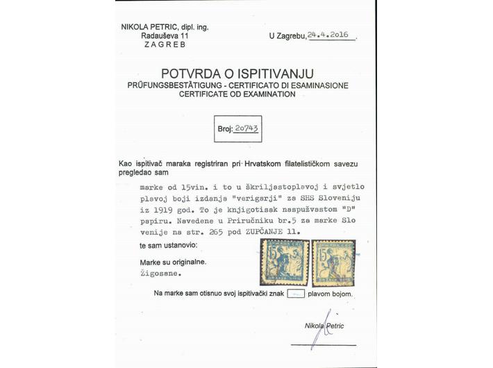 Description: Stamp 10 vinara in rare red color, and in zig-zag roulette perforation, described in HFS No. 5 under 24 Be. Two stamps 15 vinara in light blue and rare blue color printend on sponge D paper. Described in HFS No. 5 on page 265 under perforation 11. Stamp 50 vinara in black-olive-green color described in HFS No. 5 under 17 Bdl. Photo certificate Petric.