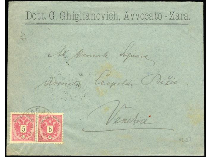 Letter sent from Zadar to Venezia 16.12. 1888 Description: Letter sent from Zadar to Venezia 16.12. 1888. Franked with pair of stamps Mi.No. 46. Good quality. Letter sent from Zadar to Venezia 16.12. 1888 Auction: Aukcija br. 48 - Filatelija i razglednice Catalog No: 27 Category: Croatia until 1918 Quality: ✉ Current offer is at 14EUR. In order to place your bid your offer needs to be at least 14EUR or higher. Please place your bid: Other items from the category: Croatia until 1918 ☉ 22 40 EUR ✉ 23 45 EUR ✉ 24 12 EUR ✉ 25 70 EUR ✉ 26 14 EUR ✉ 27 14 EUR ✉ 28 25 EUR ✉ 29 35 EUR ✉ 30 35 EUR ✉ 31 10 EUR ☉ 32 12 EUR ✉ 33 25 EUR ✉ 34 20 EUR ✉ 35 55 EUR ✉ 36 20 EUR ✉ 37 20 EUR ✉ 38 25 EUR ✉ 39 25 EUR ✉ 40 75 EUR ✉ 41 20 EUR 1234→
