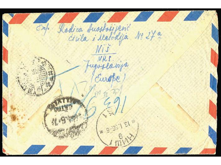 Letter sent by registered and airmail from Niš to Indonesia 07.11. 1955. Description: Letter sent by registered and airmail from Niš to Indonesia 07.11. 1955. Because recipient is unknown, letter returned to sender. Interesting destination. Letter sent by registered and airmail from Niš to Indonesia 07.11. 1955. Auction: Aukcija br. 48 - Filatelija i razglednice Catalog No: 991 Category: Yugoslavia Quality: ✉ Current offer is at 20EUR. In order to place your bid your offer needs to be at least 20EUR or higher. Please place your bid: Other items from the category: Yugoslavia ** 978 70 EUR (*) 979 100 EUR ** 980 80 EUR ** 981 110 EUR 982 20 EUR 983 70 EUR ✉ 984 25 EUR ✉ 985 25 EUR ✉ 986 12 EUR ✉ 987 25 EUR ✉ 988 14 EUR ✉ 989 14 EUR ✉ 990 14 EUR ✉ 991 45 EUR ✉ 992 50 EUR ✉ 993 12 EUR ✉ 994 150 EUR ✉ 995 20 EUR ✉ 996 60 EUR ✉ 997 50 EUR 123→
