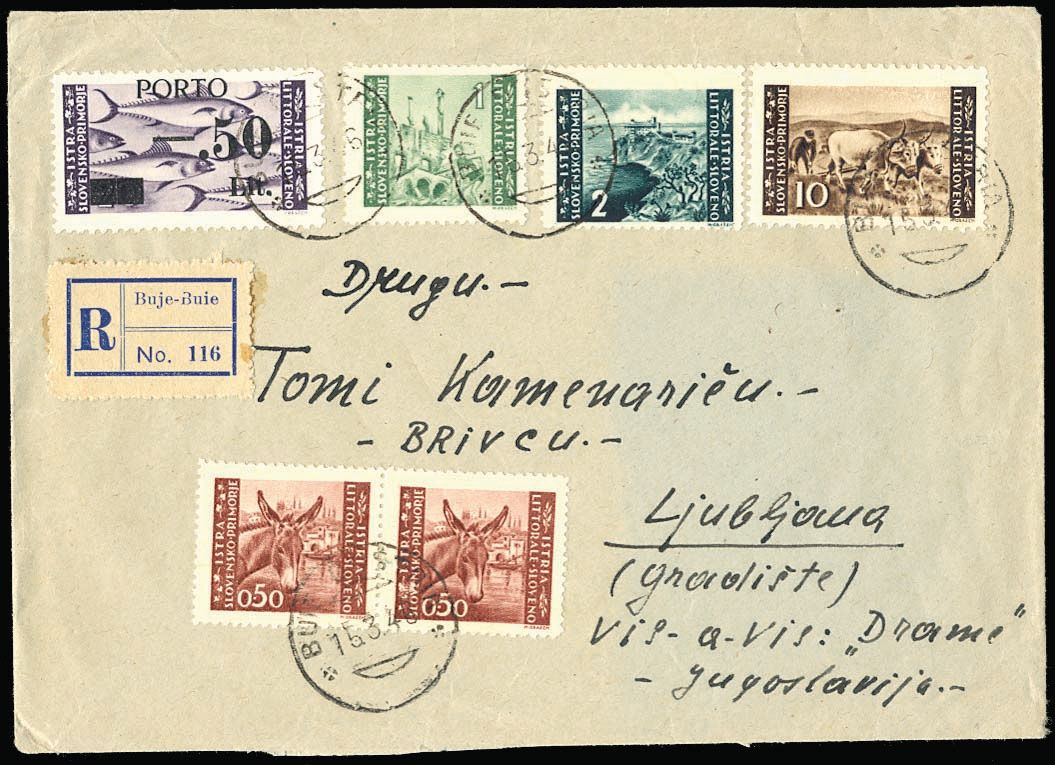 Letter sent by registered mail from Buje to Ljubljana 15.03. 1946. Description: Letter sent by registered mail from Buje to Ljubljana 15.03. 1946. Transit Rijeka 16.03. Interesting franking and excellent quality. Letter sent by registered mail from Buje to Ljubljana 15.03. 1946. Auction: Aukcija br. 48 - Filatelija i razglednice Catalog No: 974 Category: Istria and slovene littoral Quality: ✉ Current offer is at 350EUR. In order to place your bid your offer needs to be at least 370EUR or higher. Please place your bid: Other items from the category: Istria and slovene littoral * 921 90 EUR ✉ 922 25 EUR ▲ 923 40 EUR * 924 35 EUR ** 925 45 EUR * 926 16 EUR ▲ 927 20 EUR ▲ 928 20 EUR ✉ 929 220 EUR ✉ 930 35 EUR ** 931 60 EUR ** 932 40 EUR ** 933 40 EUR ** 934 40 EUR ** 935 25 EUR ** 936 25 EUR ** 937 25 EUR ** 938 25 EUR ** 939 40 EUR ** 940 30 EUR 123→