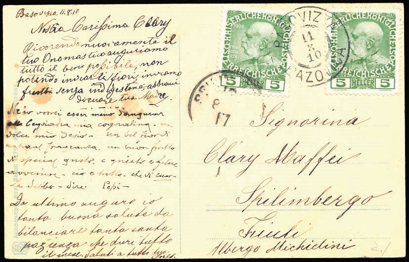 Postcard with rare cancel of post office Bazovica 11.08. 1911. Description: Postcard with rare cancel of post office Bazovica 11.08. 1911. Postcard with rare cancel of post office Bazovica 11.08. 1911. Auction: Aukcija br. 48 - Filatelija i razglednice Catalog No: 730 Category: Slovenia Quality: ✉ Current offer is at 12EUR. In order to place your bid your offer needs to be at least 12EUR or higher. Please place your bid: Other items from the category: Slovenia ✉ 674 130 EUR ✉ 675 260 EUR ✉ 676 18 EUR ✉ 677 400 EUR ✉ 678 340 EUR ✉ 679 160 EUR ✉ 680 25 EUR ✉ 681 20 EUR (*) 682 100 EUR * 683 45 EUR ** 684 16 EUR ** 685 20 EUR ☉ 686 45 EUR ☉ 687 16 EUR **/* 688 45 EUR **/* 689 30 EUR * 690 16 EUR ☉ 691 14 EUR ** 692 30 EUR ▲ 693 20 EUR 1234→
