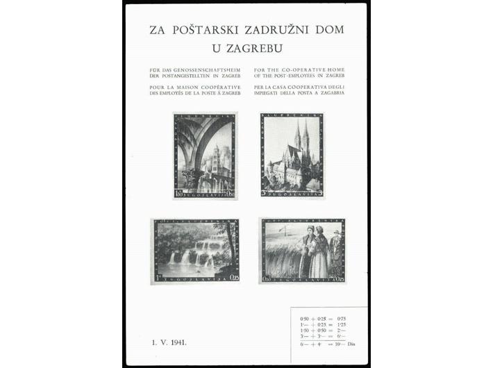 A rare prospect for stamp with supplement Description: A rare prospect for stamp with supplement, for the occasion of building postal cooperative home in Zagreb. Stamps were scheduled for release 01.05. 1941, but after the breakup of Kingdom they were not released. A rare prospect for stamp with supplement Auction: Aukcija br. 48 - Filatelija i razglednice Catalog No: 888 Category: Kingdom of Yugoslavia Current offer is at 20EUR. In order to place your bid your offer needs to be at least 20EUR or higher. Please place your bid: Other items from the category: Kingdom of Yugoslavia (*) 829 30 EUR (*) 830 14 EUR ** 831 50 EUR ** 832 35 EUR ** 833 100 EUR (*) 834 900 EUR ** 835 110 EUR ** 836 80 EUR ** 837 100 EUR 838 130 EUR (*) 839 140 EUR ** 840 35 EUR (*) 841 430 EUR ** 842 14 EUR ☉ 843 30 EUR 844 55 EUR 845 20 EUR ✉ 846 40 EUR ✉ 847 30 EUR ✉ 848 18 EUR 1234→
