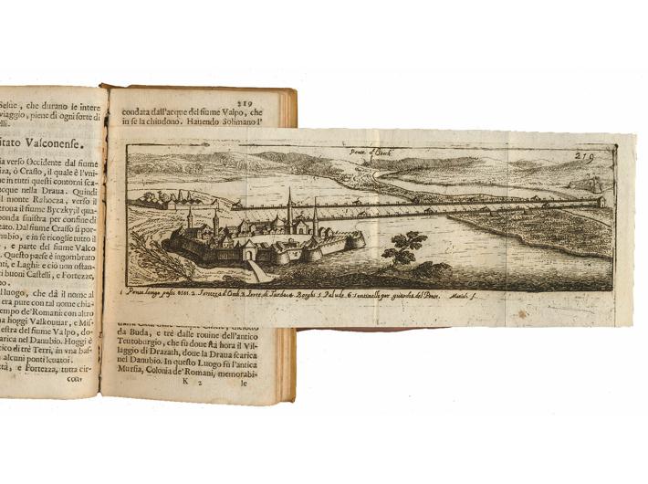 Description: Simpliciano Bizozeri: Notizia particolare dello stato passato e presente de’ Regni d’ Ungheria, Croatia e Principato di Transilvania, cioe descrizione di tutti i comitati, città, fortezze e luoghi più insigni de medesimi, loro sito, qualità, ricchezze e genio della nazione, fatti d’ arme, assedii, piese e ripiese dele piazze, et azioni piu memorabili de’ regnanti e generali che hanno comandato o militato nelli stessi / opera di D. Sempliciano Bizozeri, adornata di 46. figure in rame delle citta piu cospicue e ritratti de principali comandanti. Bologna: per Giosetto Longi, MDCLXXXVI [1686]. Pergamenski uvez, 299 str. 8 x 14 cm. Knjiga opisuje mjesta, gradove, ljude, crkve, utvrde, vojne činjenice i znamenite vojne događaje u Hrvatskoj, Mađarskoj i Transilvaniji. Knjiga sadrži mnoštvo veduta i grafika. Od hrvatskih gradova grafiku Zrina, Virovitice, Osječkog mosta, Petrinje i Siska. Od srpskih sadrži grafike Beograda i Šapca.