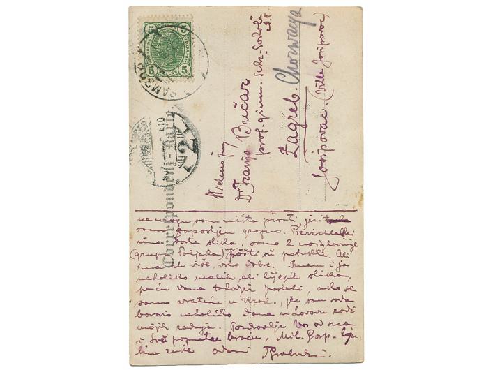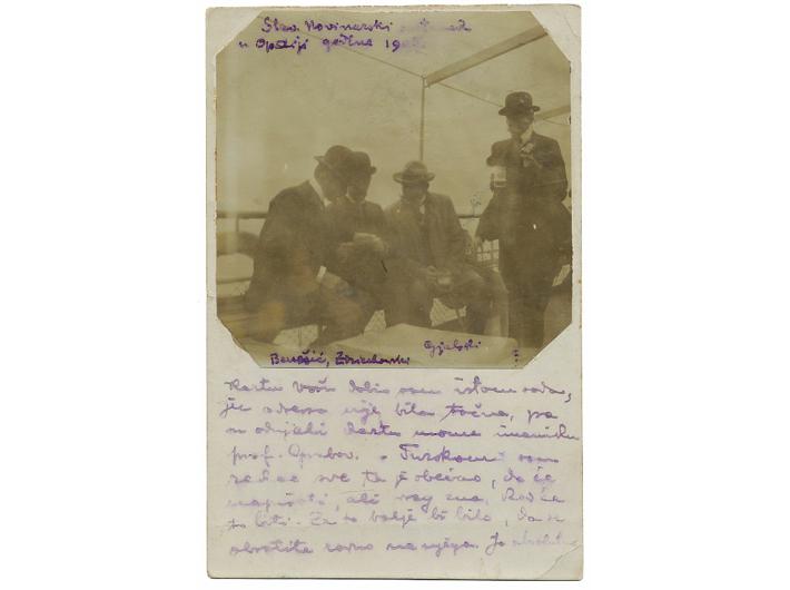 Description: SLAVENSKI NOVINARSKI SASTANAK, fotorazglednica. Opatija, 1905. 9x14 cm. Na fotografiji su Julije Benešić i Kiš Gjalski. Kao provizornu fotorazglednicu poslao ju je iz Poljske Franji Bučaru u Zagreb poljski književnik Tadeusz Stanisław Grabowski.