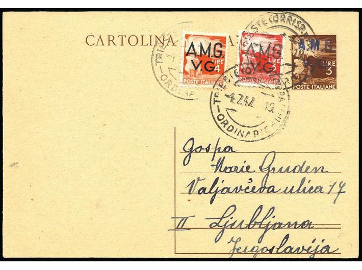Trieste, zona A, stationery additionally franked Description: Trieste, zona A, stationery additionally franked and sent from Trieste to Ljubljana 04.07. 1947. Excellent quality. Trieste, zona A, stationery additionally franked Auction: Aukcija br. 48 - Filatelija i razglednice Catalog No: 1164 Category: Documents and other Quality: ✉ Current offer is at 80EUR. In order to place your bid your offer needs to be at least 80EUR or higher. Please place your bid: Other items from the category: Documents and other ✉ 1151 60 EUR ✉ 1152 50 EUR ✉ 1153 45 EUR ✉ 1154 50 EUR ✉ 1155 30 EUR ✉ 1156 16 EUR ✉ 1157 25 EUR ✉ 1158 12 EUR ✉ 1159 80 EUR ✉ 1160 60 EUR ✉ 1161 20 EUR ✉ 1162 300 EUR ✉ 1163 180 EUR ✉ 1164 80 EUR 1165 50 EUR 1166 50 EUR 1167 100 EUR 1168 100 EUR 1169 150 EUR 1170 20 EUR 1234→