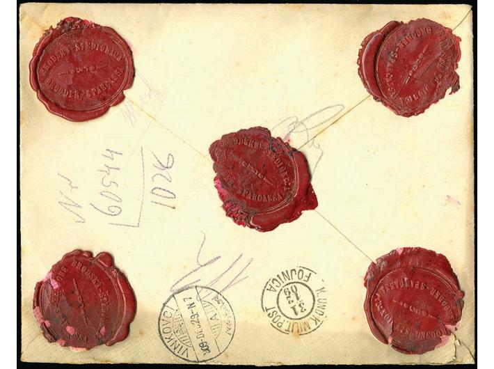 Value letter of ship's savings bank with 2 000 kruna, sent to Vinkovci Description: Value letter of Marine savings bank with 2 000 kruna, sent to Vinkovci 28.12. 1909. Recipient traveled to Fojnica in BiH. Letter redirect there. Arrival Vinkovci and Fojnica on the back. Good quality. Value letter of ship's savings bank with 2 000 kruna, sent to Vinkovci Auction: Aukcija br. 48 - Filatelija i razglednice Catalog No: 75 Category: Croatia until 1918 Quality: ✉ Current offer is at 20EUR. In order to place your bid your offer needs to be at least 20EUR or higher. Please place your bid: Other items from the category: Croatia until 1918 ☉ 22 40 EUR ✉ 23 45 EUR ✉ 24 12 EUR ✉ 25 70 EUR ✉ 26 14 EUR ✉ 27 14 EUR ✉ 28 25 EUR ✉ 29 35 EUR ✉ 30 35 EUR ✉ 31 10 EUR ☉ 32 12 EUR ✉ 33 25 EUR ✉ 34 20 EUR ✉ 35 55 EUR ✉ 36 20 EUR ✉ 37 20 EUR ✉ 38 25 EUR ✉ 39 25 EUR ✉ 40 75 EUR ✉ 41 20 EUR 1234→
