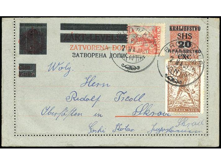 Closed stationery additionally franked Description: Closed stationery additionally franked and sent from Brod na Kupi to Skrad 07.05. 1920. Good quality, photo certificate Petric. Closed stationery additionally franked Auction: Aukcija br. 48 - Filatelija i razglednice Catalog No: 190 Category: SHS Croatia Quality: ✉ Current offer is at 45EUR. In order to place your bid your offer needs to be at least 45EUR or higher. Please place your bid: Other items from the category: SHS Croatia **/* 88 35 EUR **/* 89 30 EUR **/* 90 40 EUR **/* 91 30 EUR **/* 92 40 EUR * 93 400 EUR ** 94 80 EUR ** 95 25 EUR **/* 96 80 EUR **/* 97 80 EUR **/* 98 30 EUR **/* 99 60 EUR ** 100 70 EUR ** 101 70 EUR ** 102 40 EUR * 103 25 EUR ** 104 25 EUR ** 105 25 EUR **/* 106 40 EUR ** 107 85 EUR 1234→