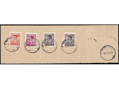 Aukcija br. 74 - Filatelija i razglednice ✉ 373 - Vrijednosno pismo filatelistički inspiriranom frankaturom loko upućeno na “Župsko nadzorničtvo rizničke straže” 09.09. 1943. 65 EUR ** 374 - Michel br.1 porto, obrnuti pretisak. 25 EUR ** 375 - Porto Michel br. 5, četverac 10 din dvostruki otisak od kojeg je jedan slijepi. 80 EUR ✉ 376 - Paketna karta za paket upućen iz Zagreba 24.02. 1944., godine u Bileću. 55 EUR ✉ 377 - Dopisnica upućena s Koločepa u Njemačku 03.07. 1943. 20 EUR ✉ 378 - Dopisnica upućena iz Srijemskih Karlovaca u Turiju u Bačkoj (tada pod Mađarskom okupacijom) 02.10. 1941. 25 EUR ** 379 - Doplatna marka br. 1 s pogreškom tiska, crveni križ na kapi. 60 EUR ** 380 - Doplatna marka Crveni križ Michel br. 1 kompletan arak sve s crvenim križem na kapi. 950 EUR ✉ 381 - Dopisnica upućena iz Varaždina u Zagreb 04.10. 1943. 35 EUR ** 382 - Ratna pomoć, neizdata marka 60 kn. 60 EUR ** 383 - Provizorno izdanje za Banja Luku. 420 EUR ▲ 384 - Lokalno izdanje za Brač, prve četiri marke iz niza (2+2; 4+4; 8+8 i 16+16) poništene aptiranim žigom pošte NEREŽIŠĆE 450 EUR ←272829303132333435→