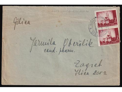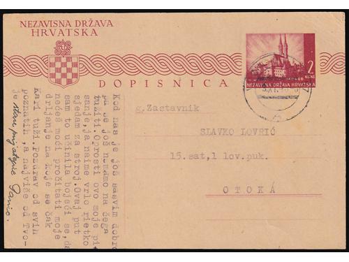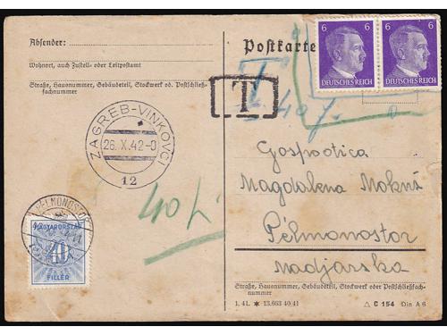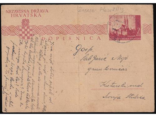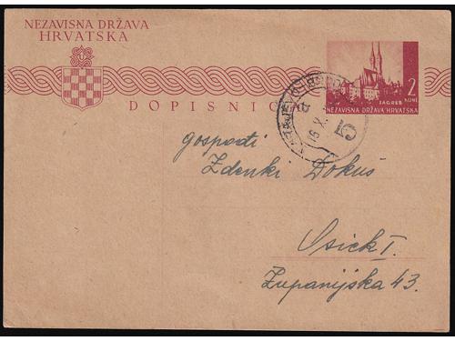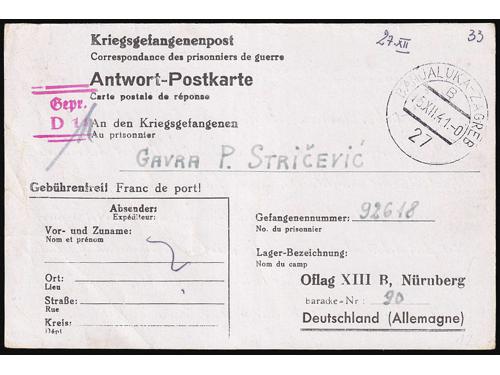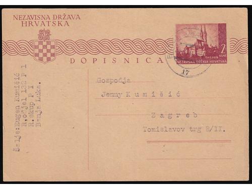 Aukcija br. 74 - Filatelija i razglednice ✉ 421 - Njemačka karta za ratne zarobljenike, dio za odgovor predana na prugu BANJA LUKA-ZAGREB 27 35 EUR ✉ 422 - Pismo upućeno prugom ZAVIDOVIĆ-HAN PIJESAK a u Vrliku 14.07. 1941. 45 EUR ✉ 423 - Pismo upućeno prugom VARAŽDIN-KOPRIVNICA-ZAGREB A u Zagreb 20.03. 1943. 30 EUR ✉ 424 - Dopisnica upućena prugom OSIJEK-ZAGREB 21 u Zagreb 02.08. 1943. 30 EUR ✉ 425 - Dopisnica pisana u Mostanjama i predana na prugu PLASE-ZAGREB 23 upućena u Donju Stubicu 17.06. 1943. 30 EUR ✉ 426 - Pismo upućeno prugom VOČIN-OSIJEK 219 u Osijek 01.08. 1941. 35 EUR ✉ 427 - Dopisnica upućena prugom PETROVARADIN-STARA PAZOVA A u Zagreb 19.03. 1943. 35 EUR ✉ 428 - Dopisnica upućena prugom SARAJEVO-BROD a5 u Osijek 16.11. 1943. 30 EUR ✉ 429 - Dopisnica upućena prugom SLAVONSKI BROD-SARAJEVO c5 u Osijek 11.01. 1944. 30 EUR ✉ 430 - Dopisnica upućena prugom BANJA LUKA-ZAGREB 17 u Zagreb 24.06. 1943. 30 EUR ✉ 431 - Dopisnica pisana u Donjem Miholjcu i upućena prugom VOČIN-OSIJEK 57A u Otok kod Vinkovaca 09.11. 1943. 30 EUR ✉ 432 - Njemačka vojnopoštanska dopisnica upućena u Beli Manastir tada pod mađarskom okupacijom. 40 EUR ←313233343536373839→