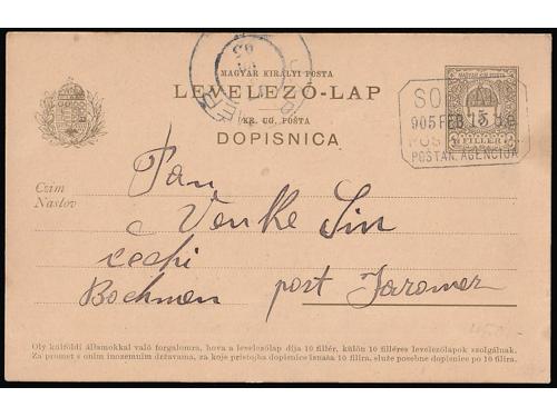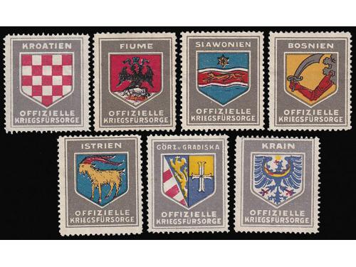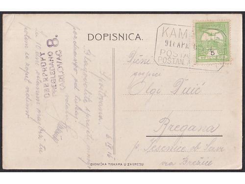 Aukcija br. 74 - Filatelija i razglednice ✉ 73 - Dopisnca upućena iz poštanske agencije SOLJANI u Češku 15.02. 1905. 18 EUR ✉ 74 - Dopisnica župnog ureda upućena iz poštanske agencije ŠLJIVOŠEVCI u Marijance z.p. Valpovo. 16 EUR ✉ 75 - Razglednica s prikazom Kamanja i Brloga upućena s poštanske agencije Kamanje u Breganu 06.04. 1916. 55 EUR (*) 76 - Dva niza vinjeta s međupoljem na temu posjeta cara Karla vojnicima na bojišnicama. 20 EUR (*) 77 - Lot vinjeta s prikazima grbova Hrvatske i Slovenije. 12 EUR 78 - Lot vinjeta sve vezano za Hrvatsku. 20 EUR **/(*) 79 - Dvije vinjete Penkala i Tjedan sporta u Opatiji 1912. 12 EUR ✉ 80 - Mađarska dopisnica s ručno izvršenom nacionalizacijom i preporučeno upućena iz Daruvara u Bjelovar 10.06. 1919. 30 EUR ✉ 81 - Razglednica upućena iz Zagreba u Gorske Mokrice 10.08. 1919 65 EUR ✉ 82 - Razglednica upućena iz Petrinje 22.01. 1919 u Novu Kapelu. 85 EUR ✉ 83 - Mađarska dopisnica s pretisnutim tekstovima i grbom te vrijednošću i dofrankirana markom 100 EUR ▲ 84 - Isječak poštanskog formulara frankiran provizornim parom maraka od 10 fill. i austrijskom markom 55 EUR ←2345678910→