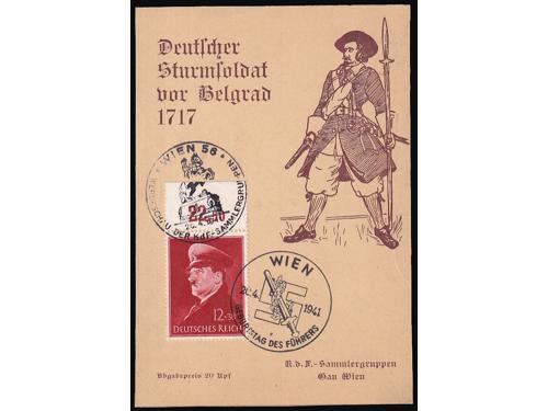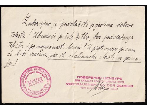 Aukcija br. 74 - Filatelija i razglednice ✉ 793 - Naputak povjerenika cenzure pri Crvenom Križu u Beogradu 20 EUR ✉ 794 - Njemačka promiđbena karta s prikazom njemačkog jurišnika kod Beograda 1717. 25 EUR ✉ 795 - Četiri vojnopoštanska pisma talijanskih vojnika upućenih iz vojne pošte PM 68 (pješačka divizija Firenza) sa sjedištem u Debru 25 EUR ✉ 796 - Preporučeno pismo upućeno iz Subotice pod Mađarskom okupacijom u Celje 06.09. 1941. 20 EUR ✉ 797 - Mađarska dopisnica dofrankirana i upućena iz Apatina u Zagreb 13.08. 1942. 20 EUR 798 - Lot vinjeta sa temom Srbija. 25 EUR * 799 - Četverac Michel br. 147 sredina vodoravno nezupčana. 10 EUR ** 800 - Četverac Michel br. 149 vodoravno nezupčan. 14 EUR * 801 - Četverac Michel br. 150 vodoravno nezupčan. 14 EUR * 802 - Četverac Michel br. 151 vodoravno nezupčan. 14 EUR ** 803 - Dva probna otiska neprihvaćenog idejnog rješenja za franko-niz Kraljevine SHS 50 EUR ** 804 - Vodoravni nezupčani 12-terac neprihvaćenog idejnog rješenja za franko-niz Kraljevine SHS 100 EUR ←626364656667686970→