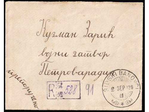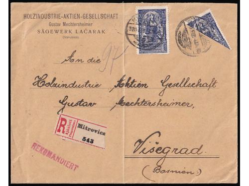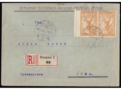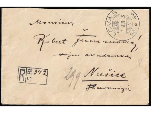 Aukcija br. 74 - Filatelija i razglednice ▲ 85 - Isječak poštanske uputnice upućene iz Drenja 23.01. 1919. 35 EUR ▲ 86 - Isječak poštanske uputnice upućene iz Drenja 23.01. 1919. 35 EUR ▲ 87 - Isječak paketne karte za paket upućen iz Metkovića u Pakrac 28.02. 1919. 70 EUR ▲ 88 - Isječak paketne karte frankiran mađarski markama s ručnim pretiskom Hrvatska 65 EUR ** 89 - Michel br. 63 četverac marke 15 fill. bijele brojke s gornjom marginom 100 EUR ** 90 - Četverac iz niza Mornari, 2 fillira II ploča, 40 EUR (*) 91 - Nezupčani šesterac marke 20 filira obostrano otisnut. II ploča. 30 EUR ✉ 92 - Pismo manjeg formata upućeno iz Splita u Californiju (USA) 31.10. 1920. 20 EUR ✉ 93 - Preporučeno pismo upućeno iz Mitrovice u Višegrad 04.02. 1919. 20 EUR ✉ 94 - Preporučeno pismo upućeno iz Lovasa u Našice 05.07. 1920. 18 EUR ✉ 95 - Pismo manjeg formata preporučeno upućeno iz Šidskih Banovaca u vojni zatvor u Petrovaradinu 02.09. 1920. 18 EUR ✉ 96 - Preporučeno pismo upućeno iz Zemuna u Rumu 13.07. 1919. 14 EUR ←34567891011→