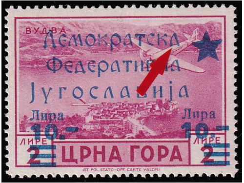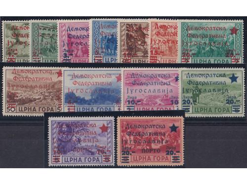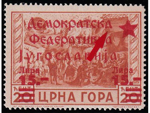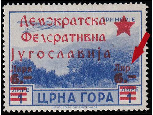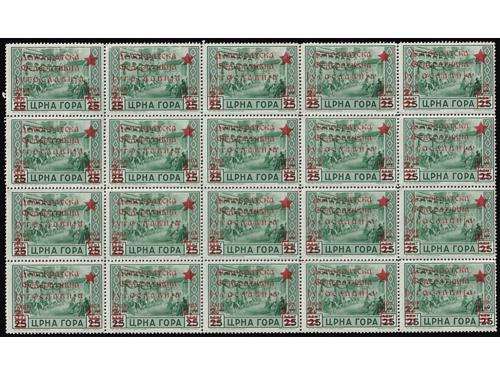 Aukcija br. 74 - Filatelija i razglednice ** 937 - Provizorno izdanje za Zagreb, pretisak 20 na 5 kn. arak 100x ali razdvojen po okomito sredini. 16 EUR ** 938 - Provizorno izdanje za Zagreb, pretisak 80 2 kn arak 100x ali razdvojen vodoravno po sredini 16 EUR 939 - Provizorno izdanje za Zagreb, lot 50 serija, a nekih nominala i više od 50 25 EUR ✉ 940 - Razglednica Splita pisana u Splitu 10.06. 1945 i upućena sa Sušaka u Zagreb. 20 EUR ✉ 941 - Razglednica Kostrene pisana 01.07. 1945 i upućena u Ljubljanu. 40 EUR ** 942 - Provizorno izdanje ze Cetinje. 150 EUR ** 943 - Provizorno izdanje za Cetinje 6 na 1 lira, pogreška pretiska LIR umjesto LIRA. 25 EUR ** 944 - Provizorno izdanje za Cetinje 15 na 20 lira, pogreška pretiska DEMOKRATSKD umjesto DEMOKRATSKA 16 EUR ** 945 - Provizorno izdanje za Cetinje 10 na 2 lire, pogreška pretiska DEMOKRATSKD umjesto DEMOKRATSKA. 20 EUR ** 946 - Provizorno izdanje za Cetinje 3 lire na 50 centi, pretisni arčić 5x4 s pogreškama pretiska 2. polja 35 EUR ** 947 - Provizorno izdanje za Cetinje 2 lire na 25 centi, pretisni arčić 5x4 s pogreškom pretiska 2. Polja 25 EUR ** 948 - Provizorno izdanje za Sentu „Mala Senta“ Marke br. 9 i 10 s nepravilnostima na gumi. 900 EUR ←747576777879808182→