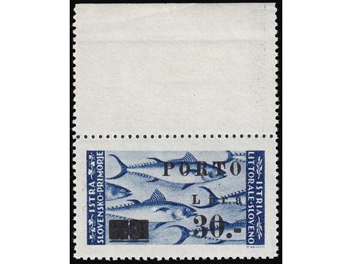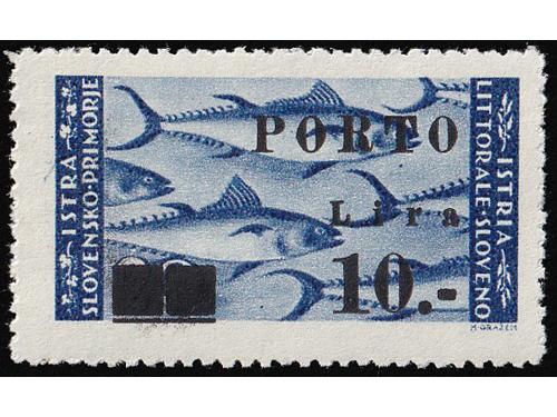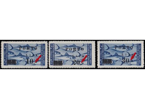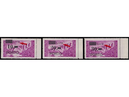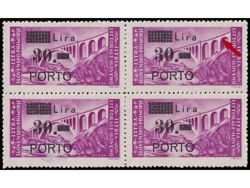 Aukcija br. 74 - Filatelija i razglednice ** 1081 - Michel br. 13 četverac s pogreškom tiska 83 polja, „čovjek na mostu“. 30 EUR ** 1082 - Michel br. 11/13 sve tri marke s pogreškom pretiska 70. polja, otvoreno „a“ u Lira. 45 EUR ** 1083 - PS br. 12/14 u šestercima, 100 EUR ☉ 1084 - Četvrto porto izdanje, pogreška pretiska 10 polja, visoko r u Lira. 40 EUR ** 1085 - Peto porto izdanje, ključne vrijednosti iz serije u četvercima i u odličnoj kvaliteti. 100 EUR ** 1086 - Peto porto izdanje pretisak 10/20 lira na marku sa slikom manjeg formata. 60 EUR ** 1087 - Peto porto izdanje pretisak 20/20 lira okomiti par od kojeg je gornja marka sa slikom manjeg formata. 95 EUR ** 1088 - Peto porto izdanje pretisak 30/20 lira na marku sa slikom manjeg formata. 60 EUR ** 1089 - Peto porto izdanje, tri ključne vrijednosti s pogreškom pretiska 25 i 30. polja, točka sa zarezom 40 EUR ** 1090 - Peto porto izdanje, tri ključne vrijednosti s pogreškom pretiska, mala točka. 50 EUR **/* 1091 - Peto porto izdanje, tri ključne vrijednosti s pogeškom pretiska 45 i 50 polja, manja i tanja decimalna crta 40 EUR ** 1092 - Peto porto izdanje, tri ključne vrijednosti s pogeškom tiska 68 polja, „mrijest“. 40 EUR ←868788899091929394→