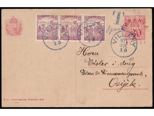 Aukcija br. 74 - Filatelija i razglednice Baranja ✉ 144 - Mađarska dopisnica provizorno izdanje za Baranju, četverobojno frankirana mađarskim markama 80 EUR ✉ 145 - Provizorna dopisnica za Baranju frankirana trojcem maraka iz niza žetelice 10 fill. 120 EUR * 146 - Provizorno porto izdanje za Baranju. 90 EUR 147 - Mali ali dobar lot maraka Baranje, dobri tipovi, četverci. 50 EUR