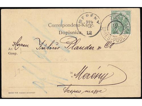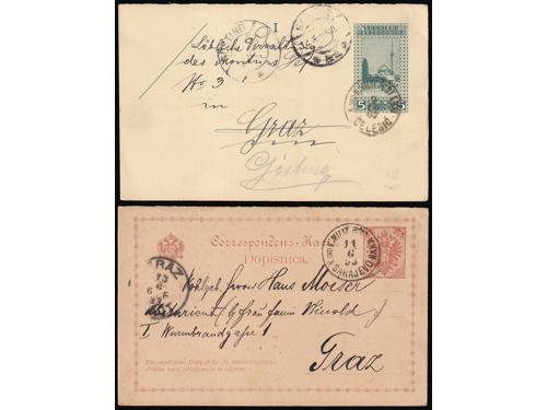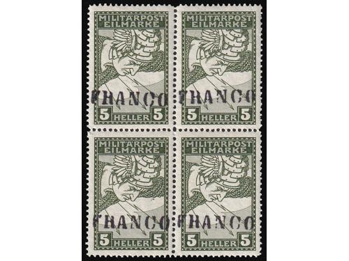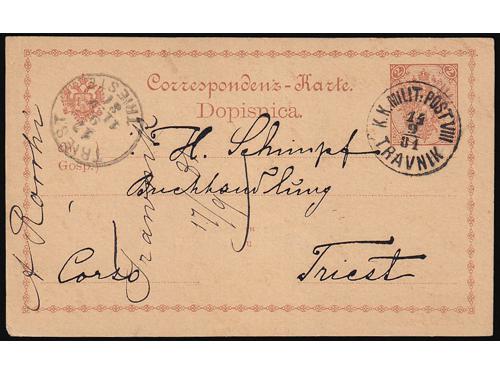 Aukcija br. 74 - Filatelija i razglednice Bosna i Hercegovina ✉ 552 - Preporučeno pismo upućeno iz Sarajeva u Konstantinopol (Carigrad) 17.04. 1895. 180 EUR 553 - Kompletan arak 10 kr. na više mjesta ojačan falcom. 340 EUR ✉ 554 - Dopisnica upućena iz Travnika u Trst 14.09. 1881. 10 EUR ✉ 555 - Lot dvije dopisnice s odgovorom. Jedna upućena iz Sarajeva u Graz 11.06. 1893 i druga upućena iz Čelebića u Graz 09.10. 1907. 16 EUR ✉ 556 - Povratnica za preporučeno pismo upućeno iz Banja Luke u Derventu 16.04. 1901. 110 EUR ✉ 557 - Dopisnica upućena prugom ZUG D.TUZLA-DOBOJ u Pettau-Slovenija 04.06. 1898. 20 EUR ✉ 558 - Dopisnica upućena prugom ZUG GRAVOSA-SARAJEVO 19.11 1902. u Esslingen. 18 EUR ✉ 559 - Poslovna dopisnica željezare u Varešu upućena prugom VAREŠ-PODLUGOVI u Mađarsku 10.07. 1906 20 EUR ✉ 560 - Razglednica Vareša upućena prugom VAREŠ-PODLUGOVI 25.06. 1906 u Beč. 20 EUR ** 561 - Nezupčane marke iz niza krajobrazi, dobra kvaliteta. 30 EUR ☉ 562 - Michel br. 64/84, žigosana u dobrom stanju. 30 EUR ** 563 - Michel br. 118 četverac s ručnim pretiskom FRANCO u crnoj boji. 30 EUR ←1234→