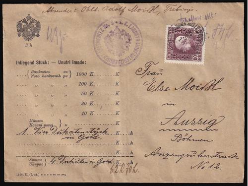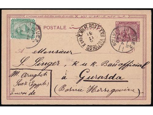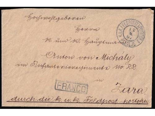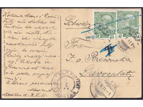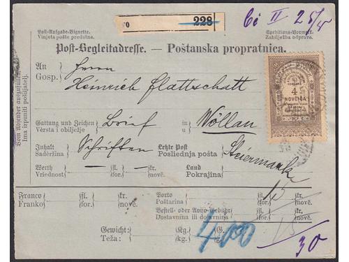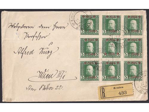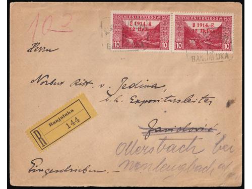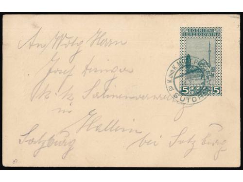Aukcija br. 74 - Filatelija i razglednice Bosna i Hercegovina ✉ 564 - Željeznička karta za jednu vožnju od 30.06. 1917. s vrlo zanimljivim biljegom BiH željeznice. 25 EUR ✉ 565 - Paketna karta za paket upućen iz Sarajeva u Wollan u Austriji 23.05. 1898. 20 EUR ✉ 566 - Paketna karta za paket upućen iz Tuzle u Primero, Južni Tirol. 03.09. 1911. 50 EUR ✉ 567 - Razglednica Mostara pisana u Mostaru 02.05. 1911. u Švicarsku. 20 EUR ✉ 568 - Dopisnica upućena iz Egipta (Suez) u Goražde 05.11. 1894. 25 EUR ✉ 569 - Pismo upućeno iz Pljevlja (Sanđak) u Zadar 12.04. 1907. 20 EUR ✉ 570 - Dopisnica upućena iz Sutorine (danas Crna Gora) u Hallein kod Salzburga 04.05. 1913. 50 EUR ✉ 571 - Vrijednosno pismo s četiri dukata u zlatu upućeno iz Trebinja 09.05. 1915. u Aussig u Češku. 20 EUR ** 572 - Michel br. 89/90 dvije serije s dva tipa brojke 4 u 1914. 18 EUR ✉ 573 - Preporučeno pismo upućeno iz Banja Luke u Zavidović 27.06. 1915. 50 EUR ✉ 574 - Preporučeno pismo upućeno iz Zenice u Beč 31.01. 1916. 75 EUR ✉ 575 - Preporučeno pismo upućeno iz Sarajeva u Lugano (Švicarska) 16.11. 1916. 35 EUR ←1234→