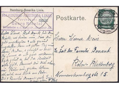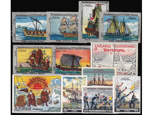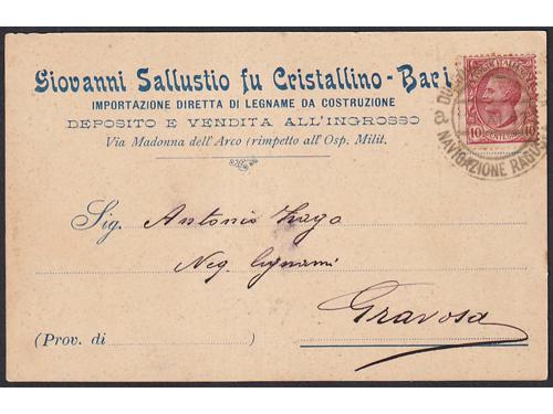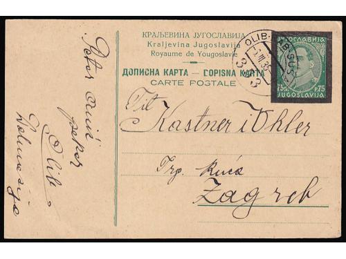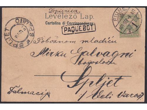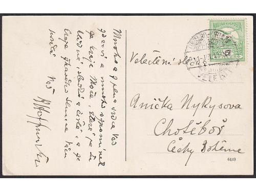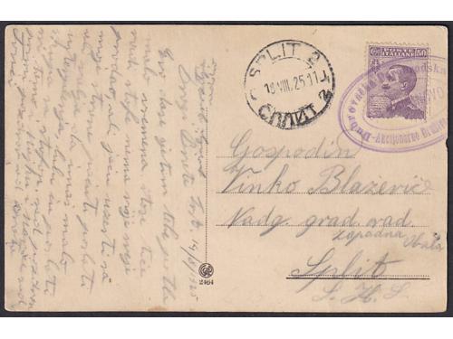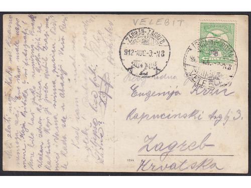 Aukcija br. 74 - Filatelija i razglednice Brodovi ✉ 1257 - Čestitka upućena brodom VELEBIT u vlasništvu Ungaro-Croato brodarskog društva u Zagreb 03.08. 1912. 18 EUR ✉ 1258 - Razglednica Novog Vinodolskog upućena brodskom linijom Ungaro-Croato, brod Velebit 11.07. 1912 u Češku. 20 EUR ✉ 1259 - Razglednica Rijeke upućena brodom (PAQUEBOT) iz Rijeke u Split 08.09. 1901. 16 EUR ✉ 1260 - Razglednica Briuna upućena s parobroda PALATINO Lloyda Triestino u Bolzano 23.09. 1922. 30 EUR ✉ 1261 - Poslovna dopisnica upućena iz Barija u Gruž 11.11. 1911., poništena žigom Dubrovačka plovidba-Navigazione Ragusea. 25 EUR ✉ 1262 - Razglednica Trsta upućena brodom KUMANOVO Dubrovačke parobrodarske plovidbe u Split 16.08. 1925. 30 EUR ✉ 1263 - Razglednica Dubrovnika upućena iz Weineheima u Köln 06.06. 1933. 12 EUR ✉ 1264 - Žalobna dopisnica kraljevine Jugoslavije pisana na Olibu i upućena brodskom linijom OLIB-RAB-SUŠAK u Zagreb. 12 EUR ✉ 1265 - Mali lot razglednica i pisama s brodskim žigovima iz Kraljevine Jugoslavije 20 EUR ▲ 1266 - Kraljevina Jugoslavija, zbirka brodskih žigova na isječcima (29 kom) 25 EUR 1267 - Lot vinjeta s temom brodovi. 20 EUR ←123