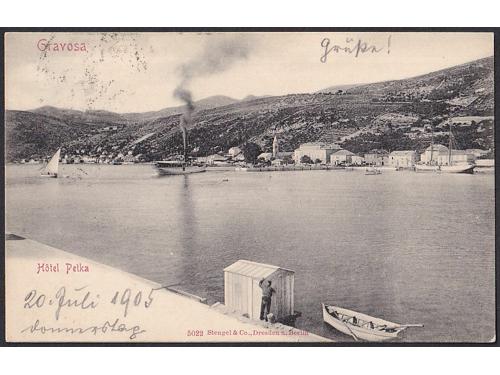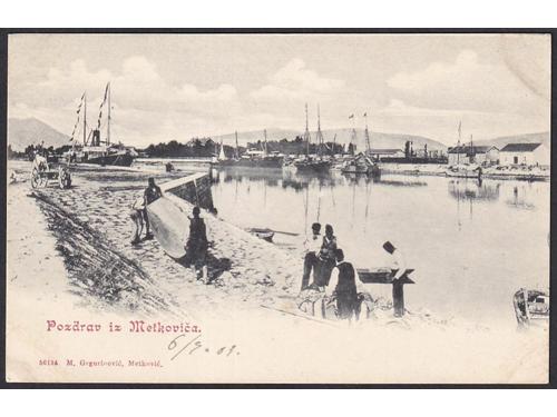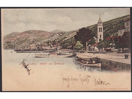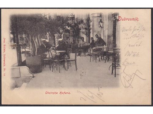 Aukcija br. 74 - Filatelija i razglednice Hrvatska - Dubrovačko-neretvanska županija #/A 2011 - Dubrovnik oko 1904. Obcinska Kafana 60 EUR O/A-B 2012 - Ragusa (Dubrovnik) oko 1904. 20 EUR O/A-B 2013 - Rektorova palača u Dubrovniku oko 1904. 20 EUR #/A 2014 - Gravosa (Gruž) oko 1904. 20 EUR #/A 2015 - Obala Gružka, 1899. 18 EUR O/A 2016 - Poluotoci Lapad i Gruž oko 1904. 20 EUR #/A 2017 - Korčula oko 1904. 18 EUR O/A 2018 - Lastovo, panorama oko 1920. 14 EUR O/A 2019 - Pozdrav iz Metkovića, oko 1904. 20 EUR #/B 2020 - Metković, oko 1904. 14 EUR #/A 2021 - Pozdrav iz Žrnova oko 1904. 20 EUR