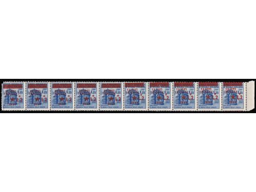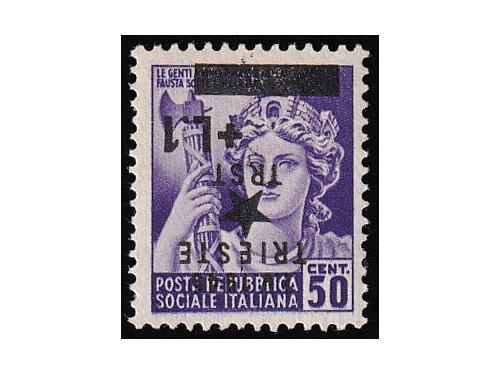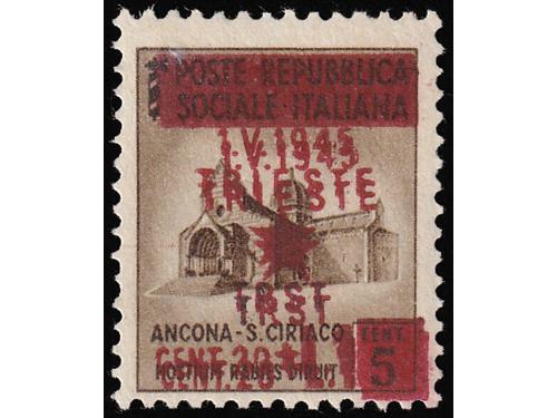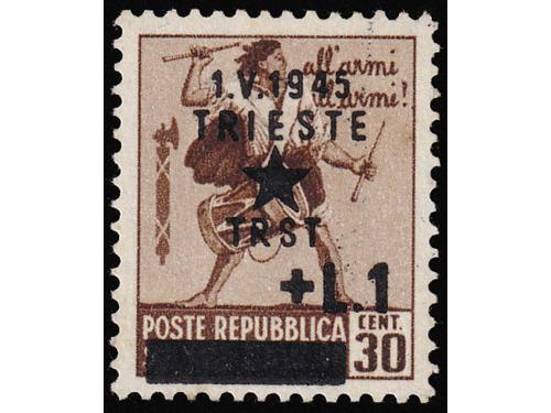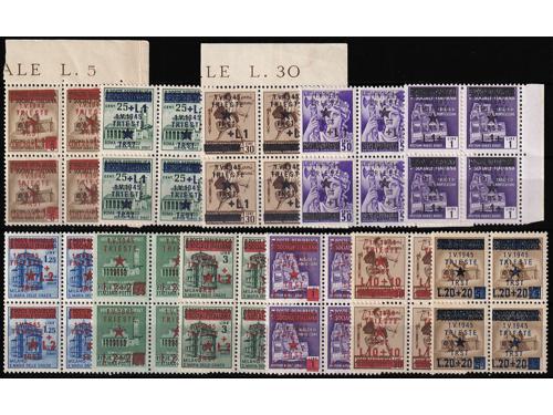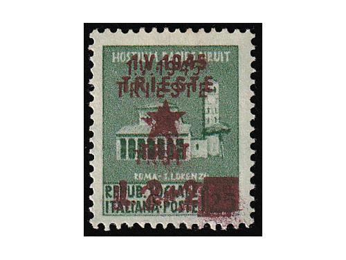 Aukcija br. 74 - Filatelija i razglednice Istra, Rijeka i Slovensko primorje ** 983 - Provizorno izdanje za Trst, kompletan niz u četvercima. 30 EUR ** 984 - Michel br. 16 DD provizorno izdanje za Trst, dvostruki pretisak. 40 EUR ** 985 - Michel br. 18Y lokalno izdanje za Trst, vodoznak, paraf Diena. 300 EUR ** 986 - Provizorno izdanje za Trst 1 l / 50 centi, obrnuti pretisak. 40 EUR ** 987 - Provizorno izdanje za Trst 2+2 L / 25 centi dvostruki pretisak 40 EUR ** 988 - Vodoravni desetarac 1,25 + 2 lire s kosim pretiskom od lijeva na desno prema gore. 30 EUR ▲ 989 - 13 izrezaka s naljepljenim markama poništenima žigom TRIEST CENTRO. 30 EUR ** 990 - Provizorno izdanje za Trst, dva kompletna arka 1 L/30 centi. Različite pretisne ploče 50 EUR ** 991 - Provizorno izdanje za Trst kompletan arak, pretisak 1 L/50 centi. 25 EUR ** 992 - Provizorno izdanje za Trst kompletan arak, pretisak 1 L/1 L. 25 EUR ** 993 - Provizorno izdanje za Trst kompletan arak, pretisak 2 L/1.25 L. 25 EUR ** 994 - Provizorno izdanje za Trst kompletan arak, pretisak 2+2 L/20 centi. 30 EUR ←123456789→