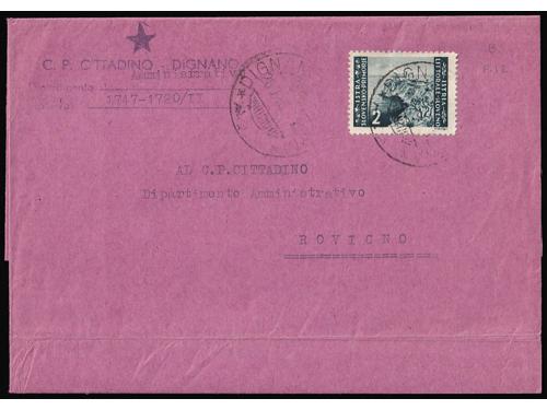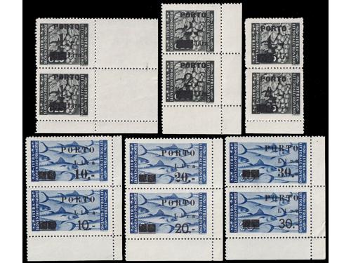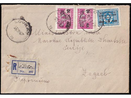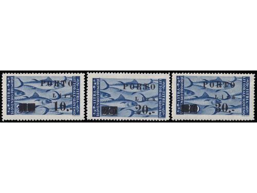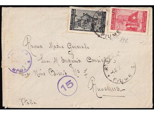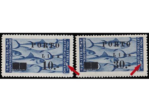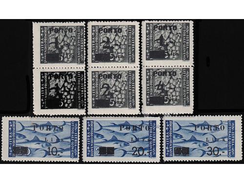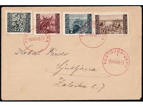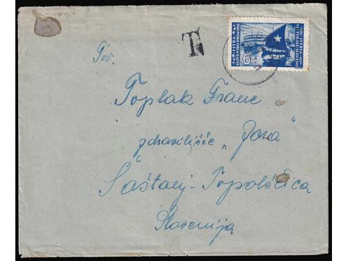 Aukcija br. 74 - Filatelija i razglednice Istra, Rijeka i Slovensko primorje **/* 1091 - Peto porto izdanje, tri ključne vrijednosti s pogeškom pretiska 45 i 50 polja, manja i tanja decimalna crta 40 EUR ** 1092 - Peto porto izdanje, tri ključne vrijednosti s pogeškom tiska 68 polja, „mrijest“. 40 EUR ** 1093 - Peto porto izdanje pretisak 10/20 i 30/20 lira. Pogreška tiska 24 polja, široki list na ornamentu 50 EUR **/* 1094 - Peto porto izdanje pretisak 10/20 i 30/20 lira. Pogreška tiska 77. polja, točka na O u SLOVENO. 40 EUR ** 1095 - Michel br. 14/19 okomiti parovi, sve donje marke „tanke brojke“. 900 EUR * 1096 - Peto porto izdanje, tanke brojke, prve tri vrijednosti okomiti parovi. 200 EUR ✉ 1097 - Pismo upućeno iz Rijeke u Ravenu 04.06. 1946. 40 EUR ✉ 1098 - Pismo upućeno iz Rijeke u Rim 30.11. 1946. 18 EUR ✉ 1099 - Točkice za hranu grada Pule upućene kao tiskanica iz Vodnjana u Rovinj 27.06. 1945 40 EUR ✉ 1100 - Pismo upućeno iz Idrije u Šostanj-Topolščica. 55 EUR ✉ 1101 - Pismo upućeno iz Postojnske Jame u Ljubljanu 15.08. 1945. 40 EUR ✉ 1102 - Preporučeno pismo točno frankirano (pismo 8.00 i preporuka 16.00 lira) upućeno iz Lovrana u Zagreb 15.08. 1947. 80 EUR ←6789101112→