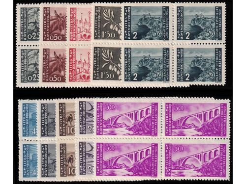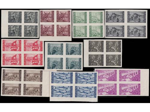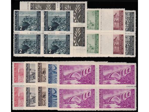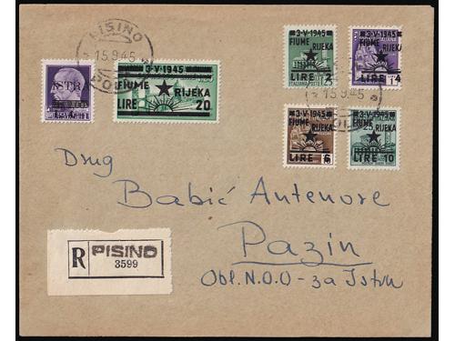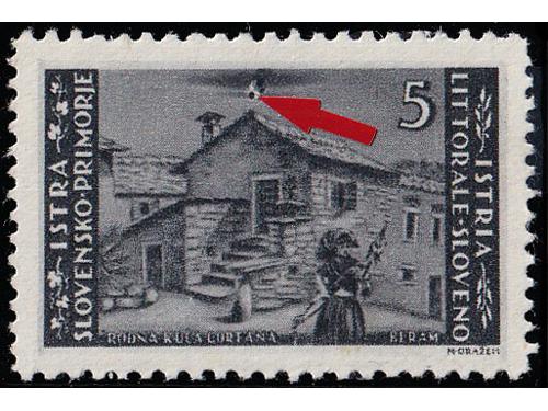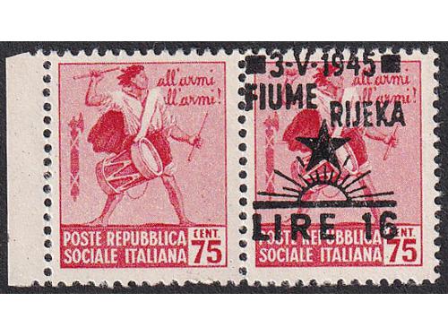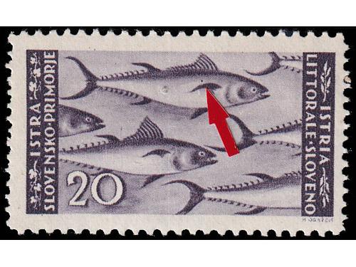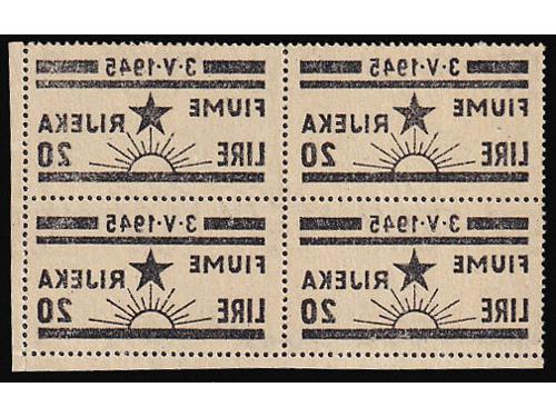 Aukcija br. 74 - Filatelija i razglednice Istra, Rijeka i Slovensko primorje ** 1007 - Provizorno izdanje za Rijeku, vodoravni par bez i s pretiskom 16.00/75 centi. 300 EUR ** 1008 - Provizorno izdanje za Rijeku, četverac 20.00/1.25 lira s vrlo izreženim probojem pretiska. 30 EUR ✉ 1009 - Preporučeno filatelistički inspirirano pismo upućeno loko Pazin 15.09. 1945. 40 EUR ✉ 1010 - Razglednica Opatije upućena iz Opatije u Zagreb 22.09. 1945. 30 EUR ** 1011 - Ljubljansko izdanje, kompletna serija PS br. 12/21 u četvercima 75 EUR ** 1012 - PS br. 18 atraktivna pogreška tiska na 16 poziciji u arku, pomrčina. 25 EUR ** 1013 - Marka 20 lira Ljubljansko izdanje, tvrda smeđa guma, pogreška tiska, točka iznad peraje. 16 EUR ** 1014 - Marka 20 lira Ljubljansko izdanje s tvrđom smeđom gumom, za usporedbu marka s običnom gumom. 16 EUR ** 1015 - Ljubljansko izdanje 20 lira sa tvrdom smeđom gumom 35 EUR ** 1016 - Zagrebačko izdanje, kompletna serija PS br. 22/31 u četvercima 75 EUR ** 1017 - Zagrebačko izdanje, kompletan NEZUPČANI niz u četvercima 5400 EUR ** 1018 - Zagrebačko izdanje, lot maraka sve s pogreškama tiska opisanima u Novaković 30 EUR ←123456789→
