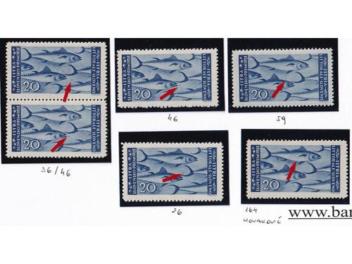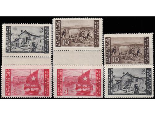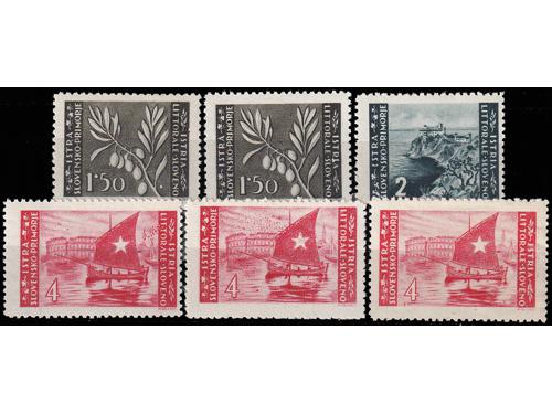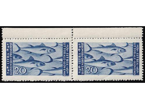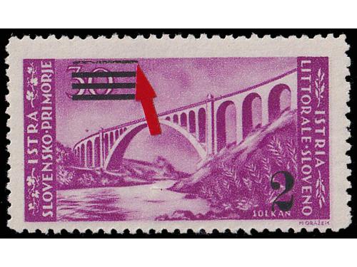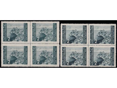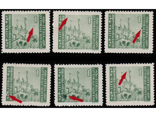 Aukcija br. 74 - Filatelija i razglednice Istra, Rijeka i Slovensko primorje ** 1019 - Zagrebačko izdanje, lot 6 maraka 1 lira sve s pogreškama tiska opisanima u Novaković 30 EUR ** 1020 - Zagrebačko izdanje lot šest maraka sve s pogeškama tiska opisanima u Novakoviću 25 EUR ** 1021 - Zagrebačko izdanje šest maraka sve s pogreškama tiska opisanima u Novakoviću 30 EUR ** 1022 - Zagrebačko izdanje vodoravni par, pogreška tiska 4. polja u arku, desna marka slika manjeg formata 40 EUR **/* 1023 - PS br. 30 lot pogrešaka tiska neobjavljenih u literaturi s navedenim pozicijama u arku. 35 EUR **/* 1024 - Zagrebačko izdanje, četiri marke sve s pogreškama tiska opisanima u Novakoviću 25 EUR ** 1025 - Zagrebačko izdanje 20 lira, četverac kod kojeg druga marka ima pogrešku tiska 68 polja, „mrijest“ 20 EUR **/* 1026 - Zagrebačko izdanje, četiri marke s pogreškama tiska opisanima u Novakoviću 30 EUR ** 1027 - Četverac drugog Zagrebačkog izdanja i uspoderni četverac prvog Zagrebačkog izdanja. 40 EUR ** 1028 - Provizorno izdanje 1946 PS br. 35/36 u četvercima 45 EUR ** 1029 - PS. br. 35 vodoravni par, desna marka s pogreškom pretiska 92. polja 25 EUR ** 1030 - PS br. 36 pogreška pretiska, četvrta greda. 50 EUR ←123456789→
