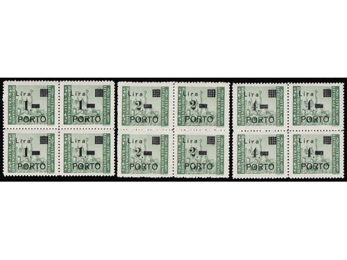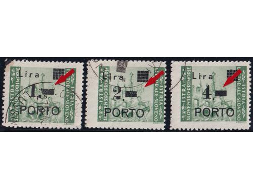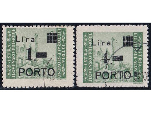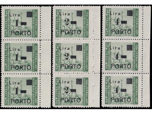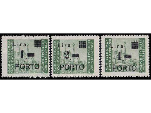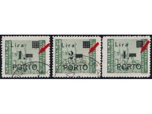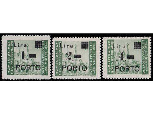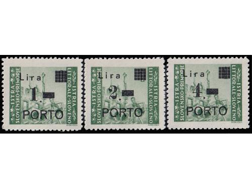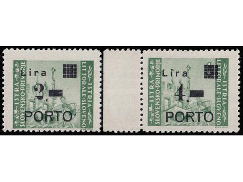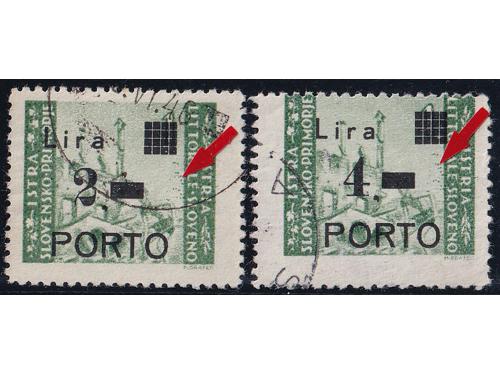 Aukcija br. 74 - Filatelija i razglednice Istra, Rijeka i Slovensko primorje ** 1055 - Michel br. 8/10 okomiti trojci pozicije u arku 60, 70 i 80. 110 EUR ** 1056 - Michel br. 8/10 u četvercu pozicije 26/27 i 36/37. 30 EUR * 1057 - PS br. 8/10 sve tri marke tip Ib točka iza nominale. 14 EUR * 1058 - PS br. 8/10 sve tri marke usko P i točka iza nominale, tip IIb. 20 EUR ** 1059 - Michel br. 8/10 sve tri s točkom iza nominale. 14 EUR ** 1060 - PS br. 9/10 s pogreškom pretiska 61 polja, oštećeno L u Lira. 20 EUR ☉ 1061 - PS br. 9/10 s pogreškom tiska na osnovnoj marci, točka ispod 1. Opisano u Novakoviću 10 EUR ☉ 1062 - PS br. 9/10 s pogreškom tiska na osnovnim markama, nakupina zelenih točki uz desni rub slike. 20 EUR ☉ 1063 - PS br. 8 i 10, pogreška tiska na osnovnoj marci, dvije zelene točke desno od tornja. 10 EUR ** 1064 - Šesto porto izdanje, četverci u odličnoj kvaliteti. 10 EUR ☉ 1065 - Treće i četvrto porto izdanje s pogreškom tiska osnovne marke „kiša“. 12 EUR ☉ 1066 - Treće i četvrto porto izdanje s pogreškom tiska na osnovnoj marci, zarez ispod slova L. 12 EUR ←34567891011→