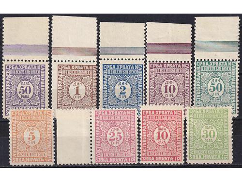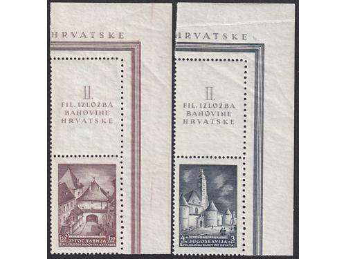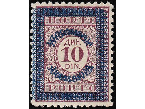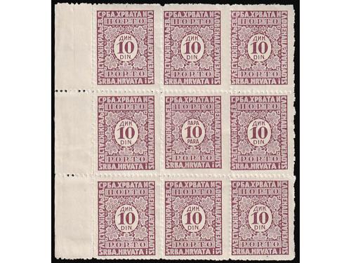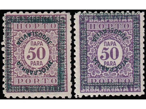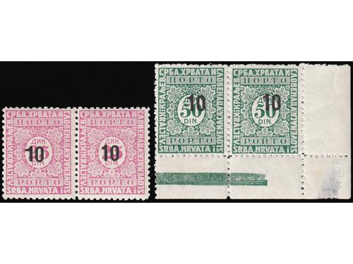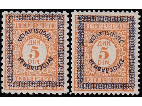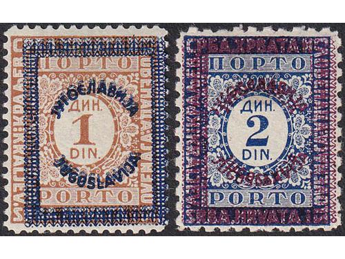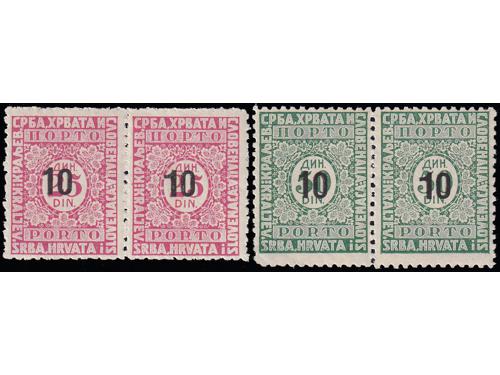 Aukcija br. 74 - Filatelija i razglednice Kraljevina Jugoslavija ** 835 - Michel br. 437c – 438 c desno zupčanje 9. 25 EUR (*) 836 - Michel br. 437/438 foto probe. 1500 EUR ** 837 - Michel br. porto 53/61 zupčanje 11 ½. 70 EUR ** 838 - Michel br. porto 53/61 zupčanje 10 ½. 120 EUR **/* 839 - Komplet porto maraka uglavnom na prvom falcu ili čiste bez falca. 140 EUR ** 840 - Michel br. Porto 53 I F deveterac, srednja marka 10 para umjesto 10 dinara. 300 EUR ** 841 - Michel br. porto 62 I/II-63 I/II parovi s dva tipa pretiska duga i kratka jedinica. 85 EUR * 842 - Michel br. P 62I/II i 63I/II. Vodoravni parovi tip I i II. 25 EUR ** 843 - Michel br. P69 zupčanje 9 i marka zupčana 10 ½. 35 EUR * 844 - Michel br. P 70C i 71 A dvostruki pretisak. 45 EUR * 845 - Michel br. P 72 BC zupčanje 10 ½ i 11 ½ obrnuti pretisak. 25 EUR * 846 - Michel br. P 73 B dvostruki pretisak zupčanje 10 ½. 35 EUR ←123456789→