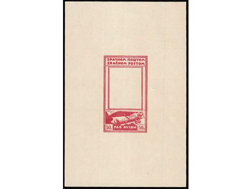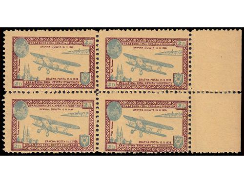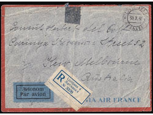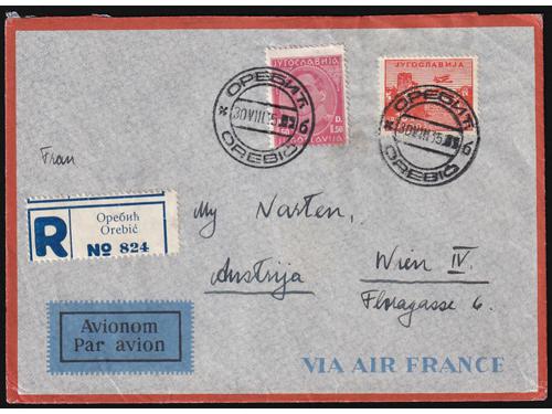 Aukcija br. 74 - Filatelija i razglednice Kraljevina Jugoslavija ✉ 871 - Komplet od 5 dopisnica mali Petar. 60 EUR ** 872 - Neprihvaćena marka za zračnu poštu 2 din. četverac u odličnoj kvaliteti. 16 EUR (*) 873 - Esej za dopisnicu zračne pošte nominale 50 para na tvrđem žućkastom kartonu u crvenoj boji. 50 EUR (*) 874 - Esej za dopisnicu zračne pošte nominale 50 para na tvrđem žućkastom kartonu u plavoj boji. 50 EUR ✈ 875 - Tiskanica upućena zrakoplovom iz Beograda u Varšavu 28.09. 1925. 40 EUR ✈ 876 - Tiskanica upućena zrakoplovom iz Beograda u Varšavu 17.03. 1926. 35 EUR ✈ 877 - Tiskanica upućena zrakoplovom iz Beograda u Budimpeštu 14.07. 1928. 30 EUR ✈ 878 - Pismo upućeno preporučeno i zrakoplovom iz Ljubljane u Zagreb 05.05. 1934. 20 EUR ✈ 879 - Preporučeno i zrakoplovom upućeno pismo iz Orebića na Korčuli u Beč 30.08. 1935. 16 EUR ✈ 880 - Preporučeno i zrakolovom upućeno pismo iz Ljubljane u Constantine (Alžir) 09.02. 1935. 30 EUR ✈ 881 - Preporučeno i zrakoplovom upućeno pismo iz Ljubljane u Melbourne (Australia) 30.10. 1936. 50 EUR ✉ 882 - Prigodna razglednica povodom otvaranja aerodroma u Ljubljani upućena zrakoplovom u Zagreb 20.08. 1933. 14 EUR ←23456789→