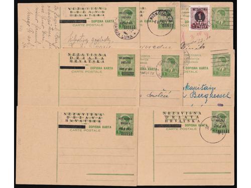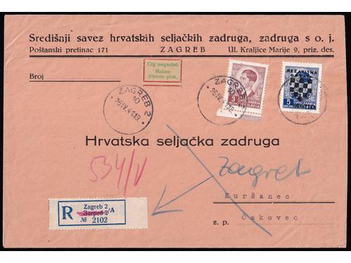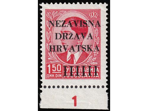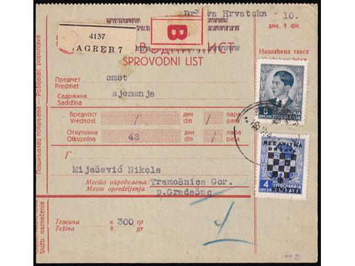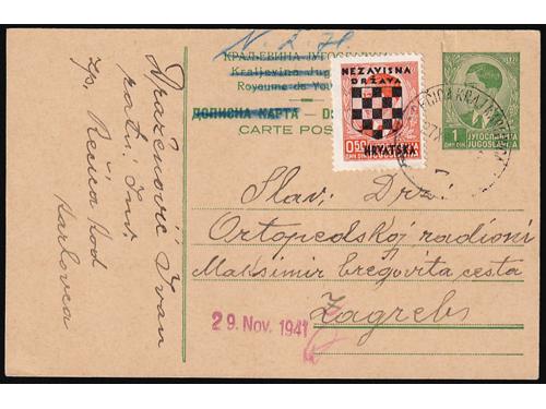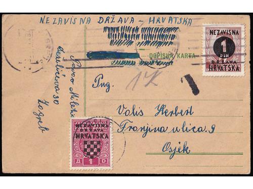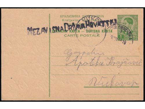 Aukcija br. 74 - Filatelija i razglednice Nezavisna Država Hrvatska ✉ 216 - Dopisnica kraljevine Jugoslavije upućena iz Nove Gradiške u Vukovar 09.08. 1941. 80 EUR ✉ 217 - Dopisnica kraljevine Jugoslavije upućena 18.11. 1941 iz Zagreba u Osijek. 100 EUR ✉ 218 - Lot provizornih cjelina i cjelina iz doba Travanjskog rata. 100 EUR ✉ 219 - Paketna karta za paket upućen iz Zagreba u Tramošnicu 16.05. 1941. 60 EUR ✉ 220 - Preporučeno pismo upućeno iz Sarajeva u Graz 23.06. 1941. 40 EUR ✉ 221 - Žurno upućeno pismo iz Bosanske Gradiške u Karlovac 16.05. 1941. 30 EUR ✉ 222 - Preporučeno pismo upućeno iz Hraščina-Trgovišće u Zagreb 03.07. 1941. 35 EUR ✉ 223 - Preporučeno pismo upućeno iz Zagreba u Kuršanec z.p. Čakovec 26.04. 1941. 25 EUR ✉ 224 - Dopisnica kraljevine Jugoslavije dofrankirana markom iz niza Grbače i upućena iz Rečice kraj Karlovca u Zagreb 27.11. 1941. 30 EUR * 225 - Michel br. 1 pogreška pretiska, nedostaje slovo A u NEZAVISNA. 30 EUR ** 226 - Michel br. 3 s oznakom tiskarske ploče 1. 25 EUR ** 227 - Michel br. 4 s djelomičnim probojem pretiska. 14 EUR ←123456789→